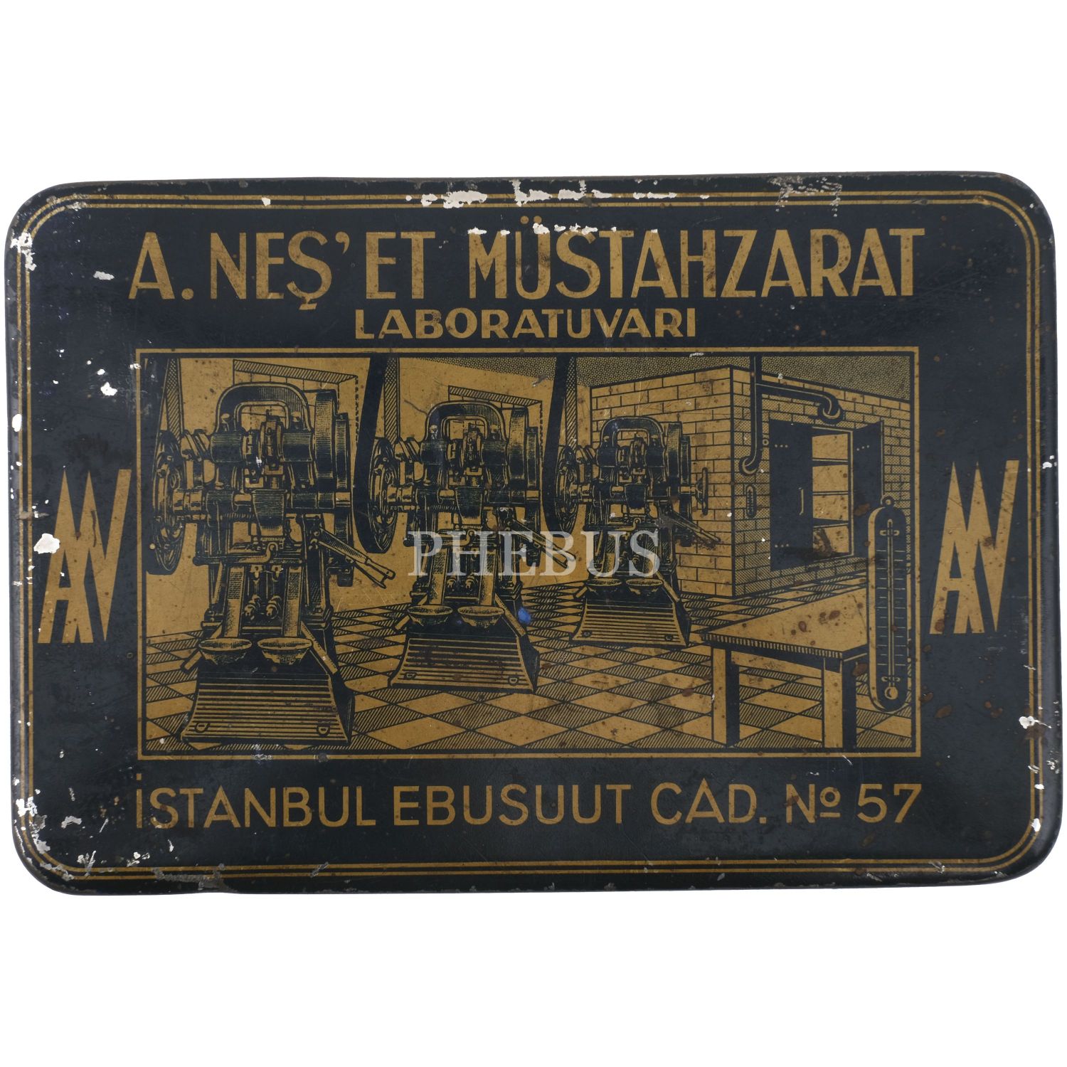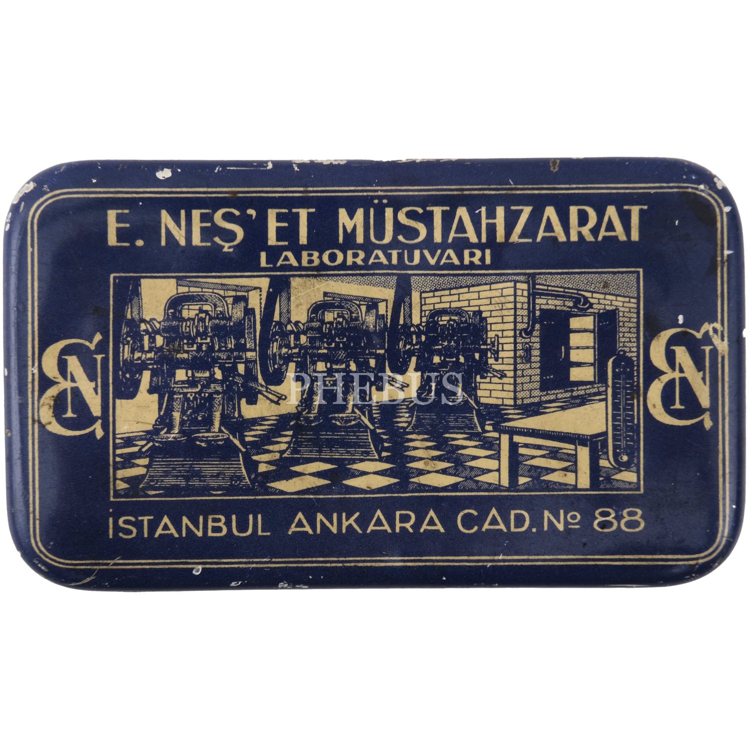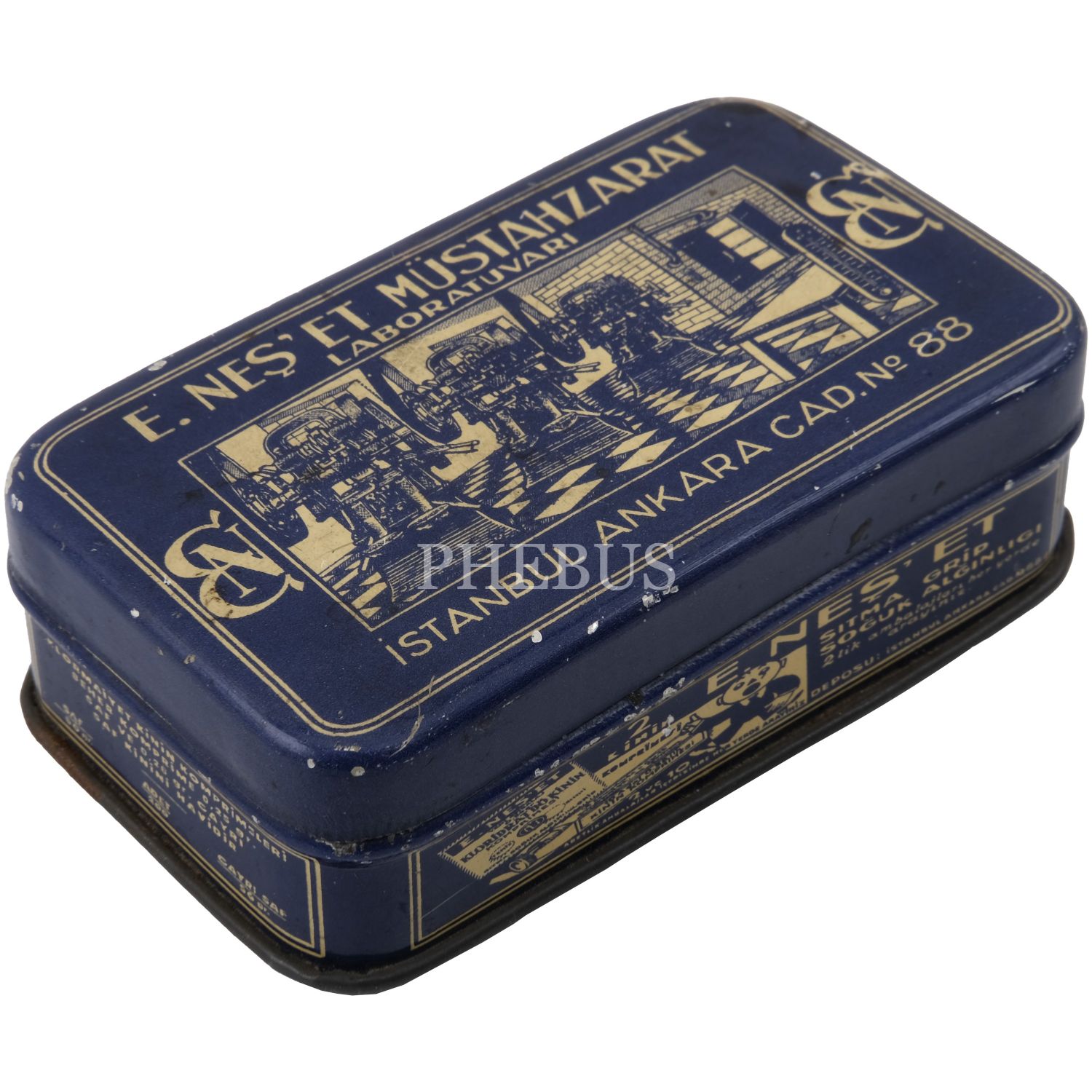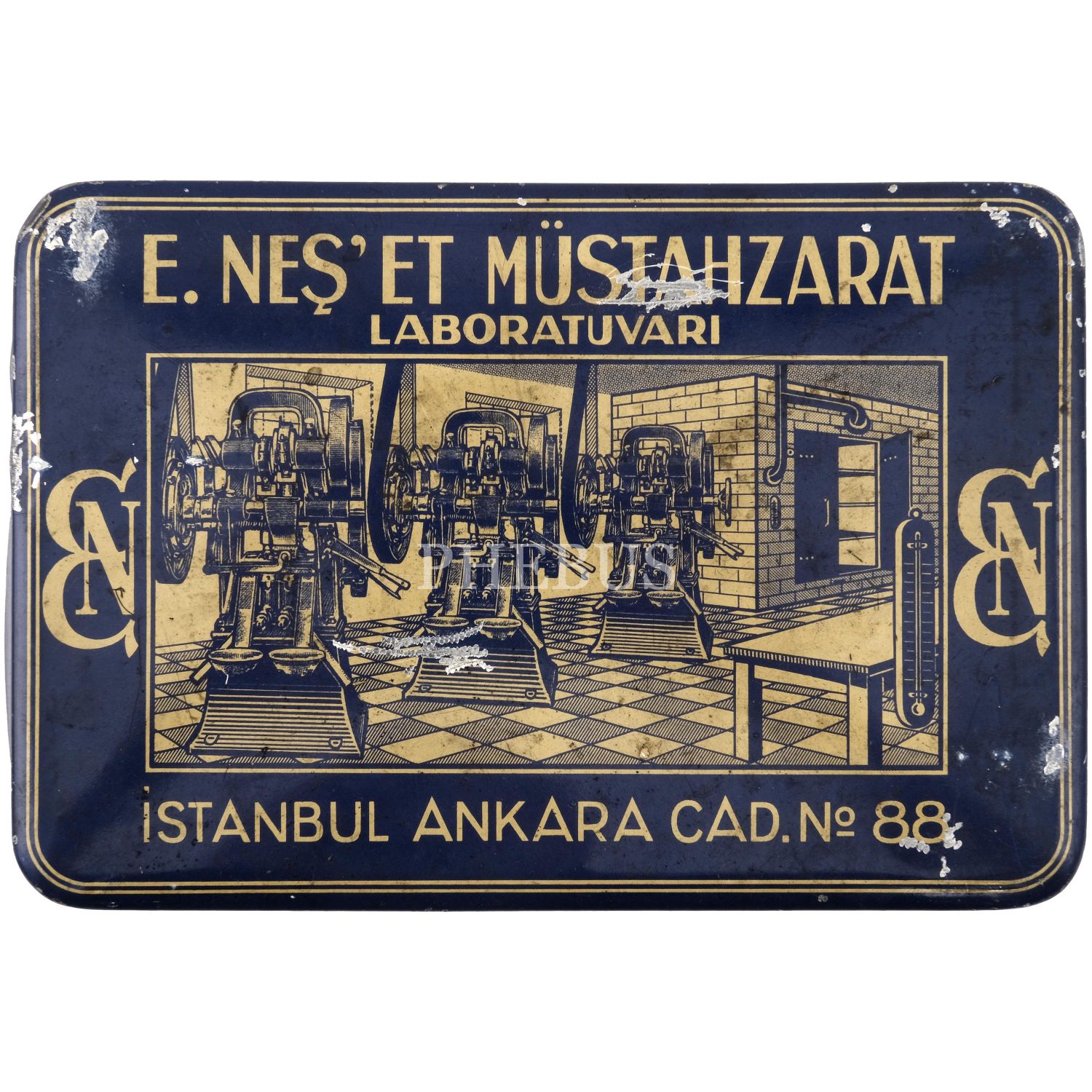 "E. Neş´et Kinin Komprimeleri: Asrımızın bütün fenni vesaitini haiz ve en son sistem makinalarımızla imâl edilen komprimelerimiz Avrupa mâmulatı fevkindedir. Bilhassa midede çabuk erimek hassası ve mıktarı tamam ve saf olması dolayısile şayanı tercihtir." Kutulardan üçü, "İstanbul Ankara Cad. No 88"; ikisi "İstanbul Ebusuut Cad. No 57" adreslidir. En büyük kutu 17,5x12x8,5 cm, en küçük kutu ise 9x5x3 cm boyutundadır.