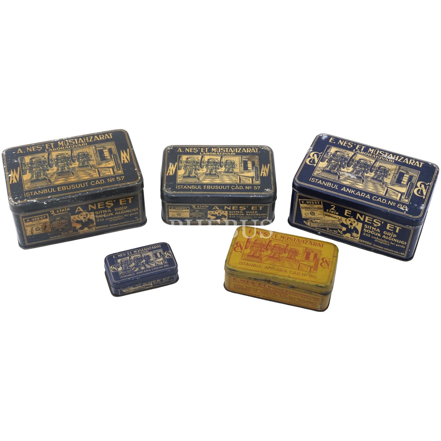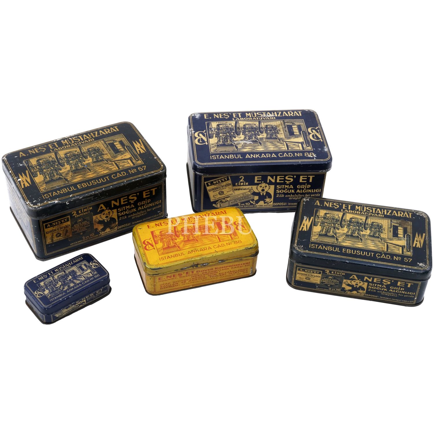 "E. Neş´et Müstahzarat Laboratuvarı (İstanbul)" yazılı ve fabrika içi görselli dört adet kinin (lacivert renkli), bir adet dover (sarı renkli) komprimeleri kutusu, muhtelif ebatlarda...