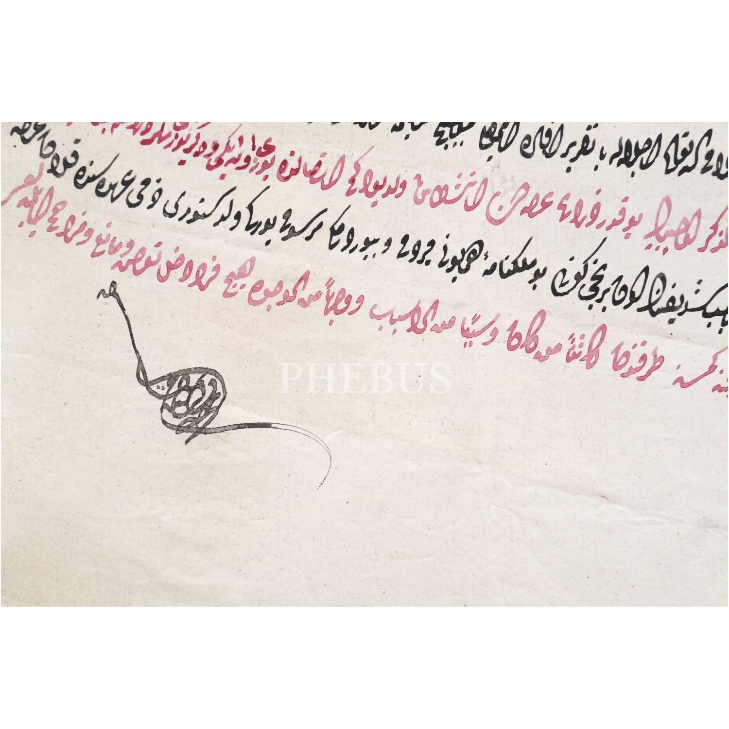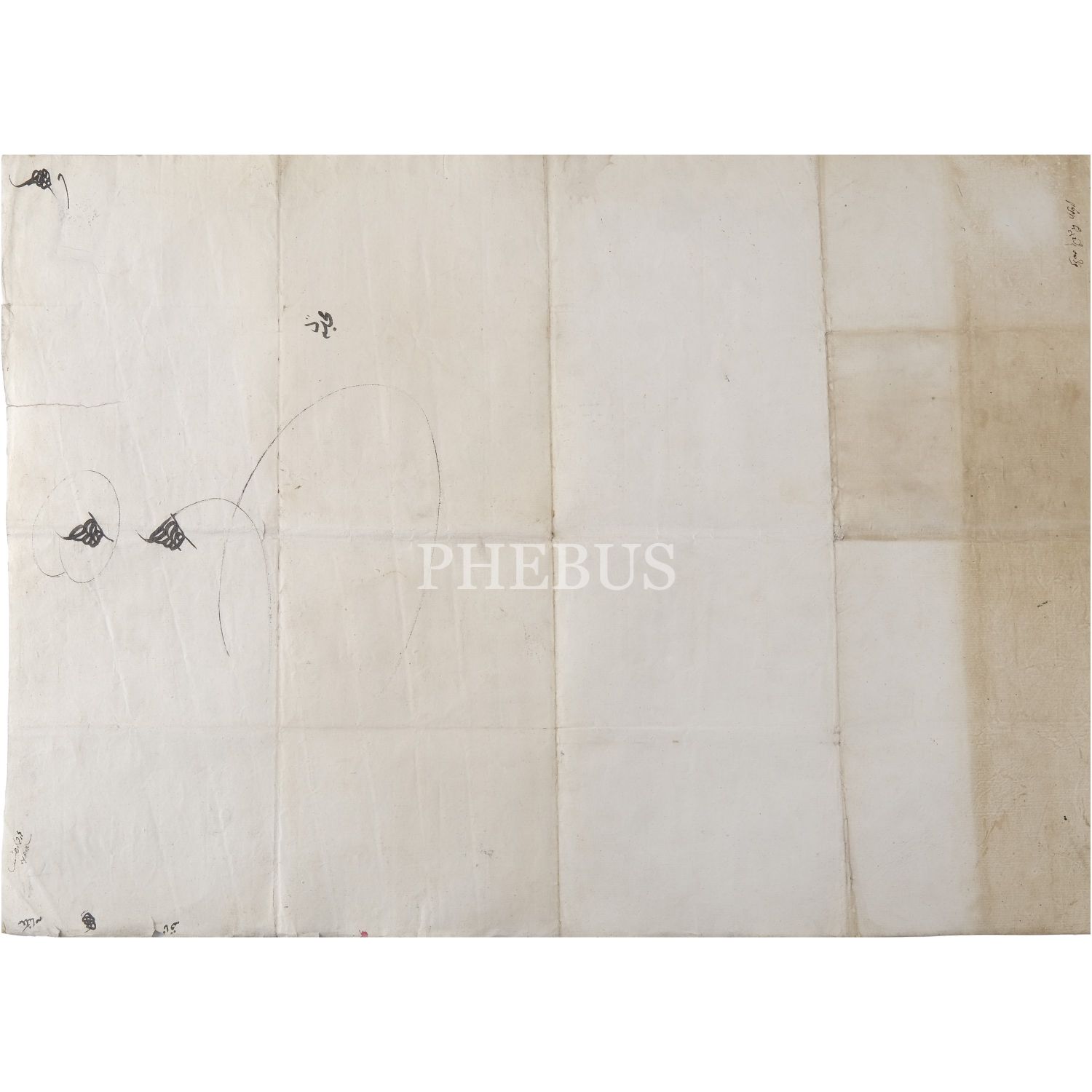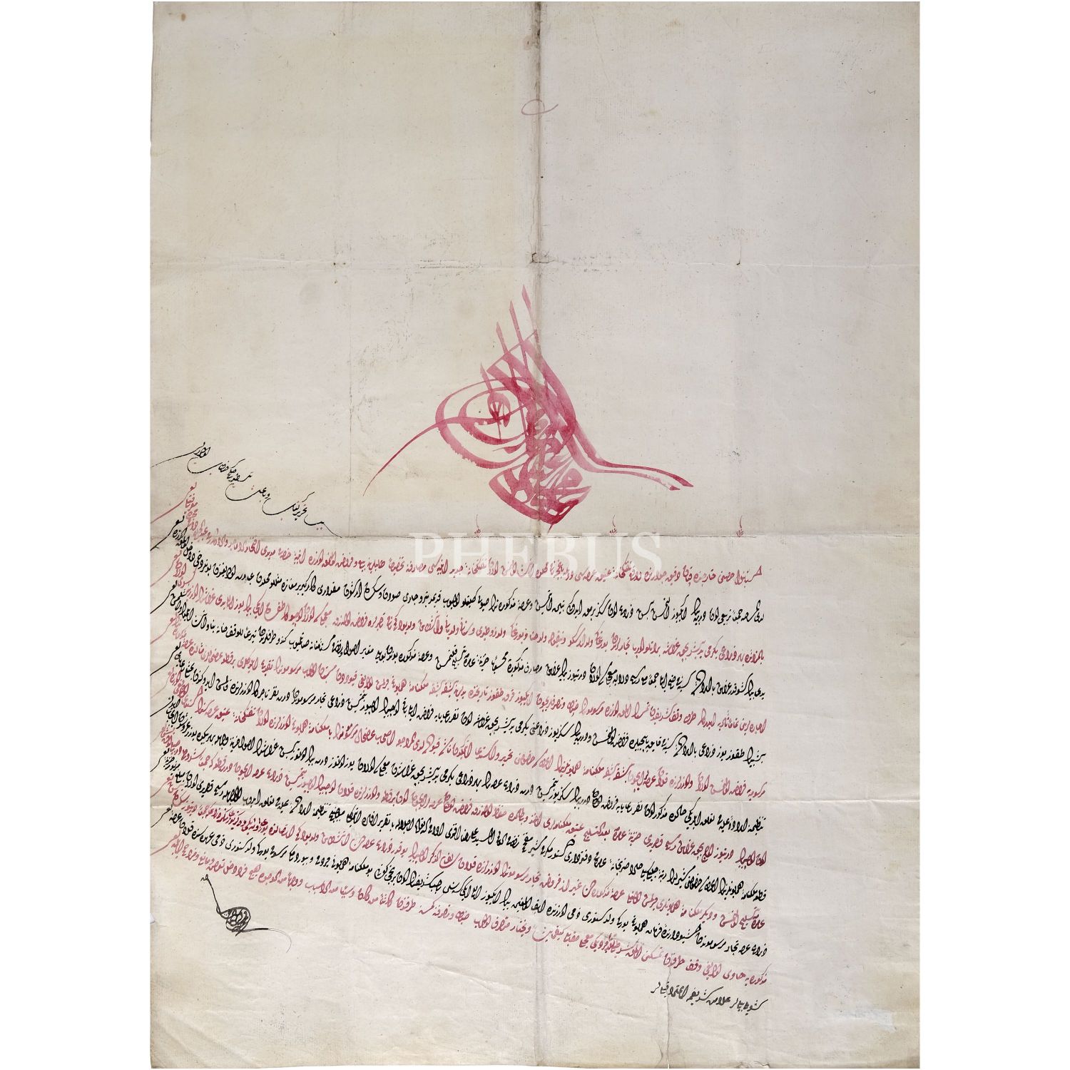 Dolmabahçe´de inşa edilen tüfek fabrikasına gelir olması için müzayede ile gayrimüslim tüccarlara satılan arsaya dair el çekme Sultan 2. Mahmud tuğralı ferman, hicrî 1252 tarihli, 56x77 cm...