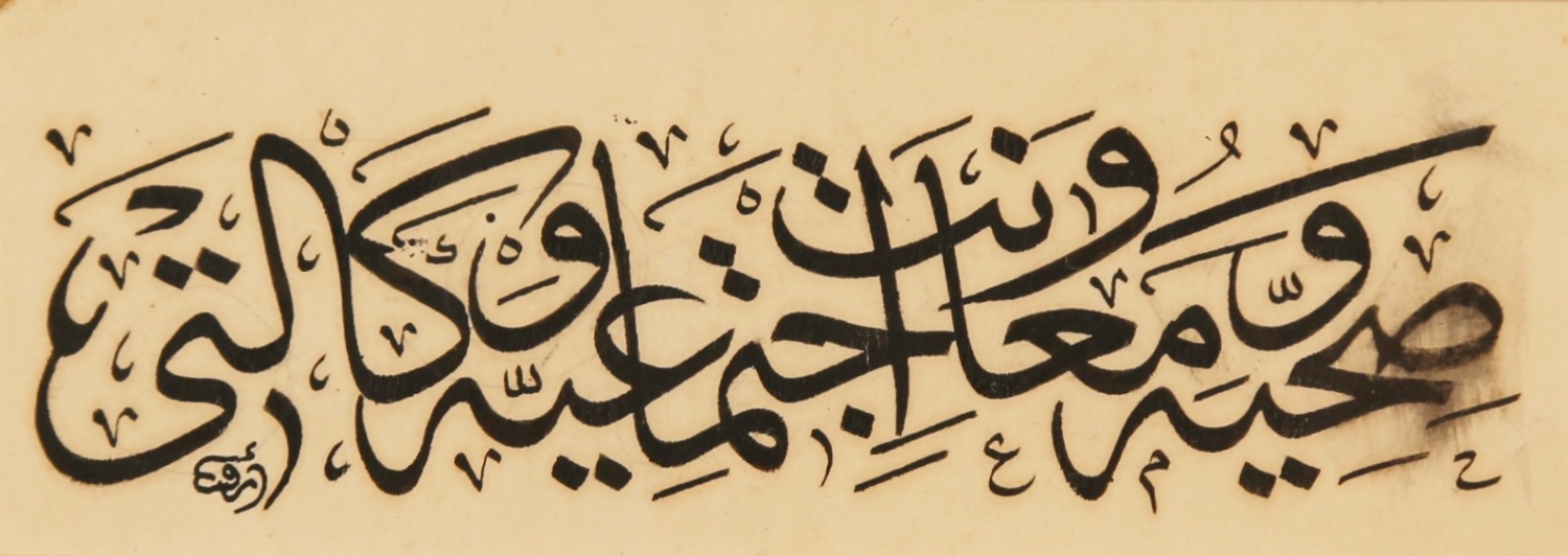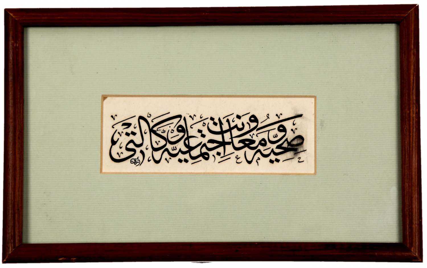 Sülüs yazı, "Sıhhiye ve Muavenet-i İctimaiyye Vekaleti [Sağlık Bakanlığı'nın eski ismi], Ahmed Re'fet ketebeli, paspartulu, çerçeveli, 12,5x5 cm.