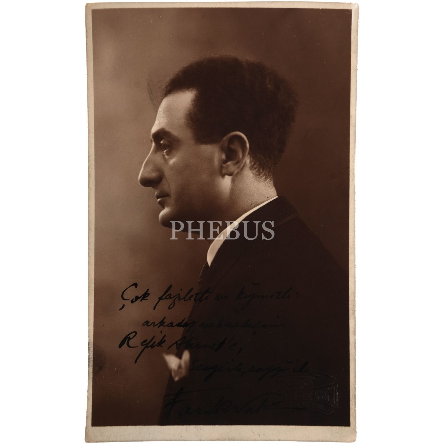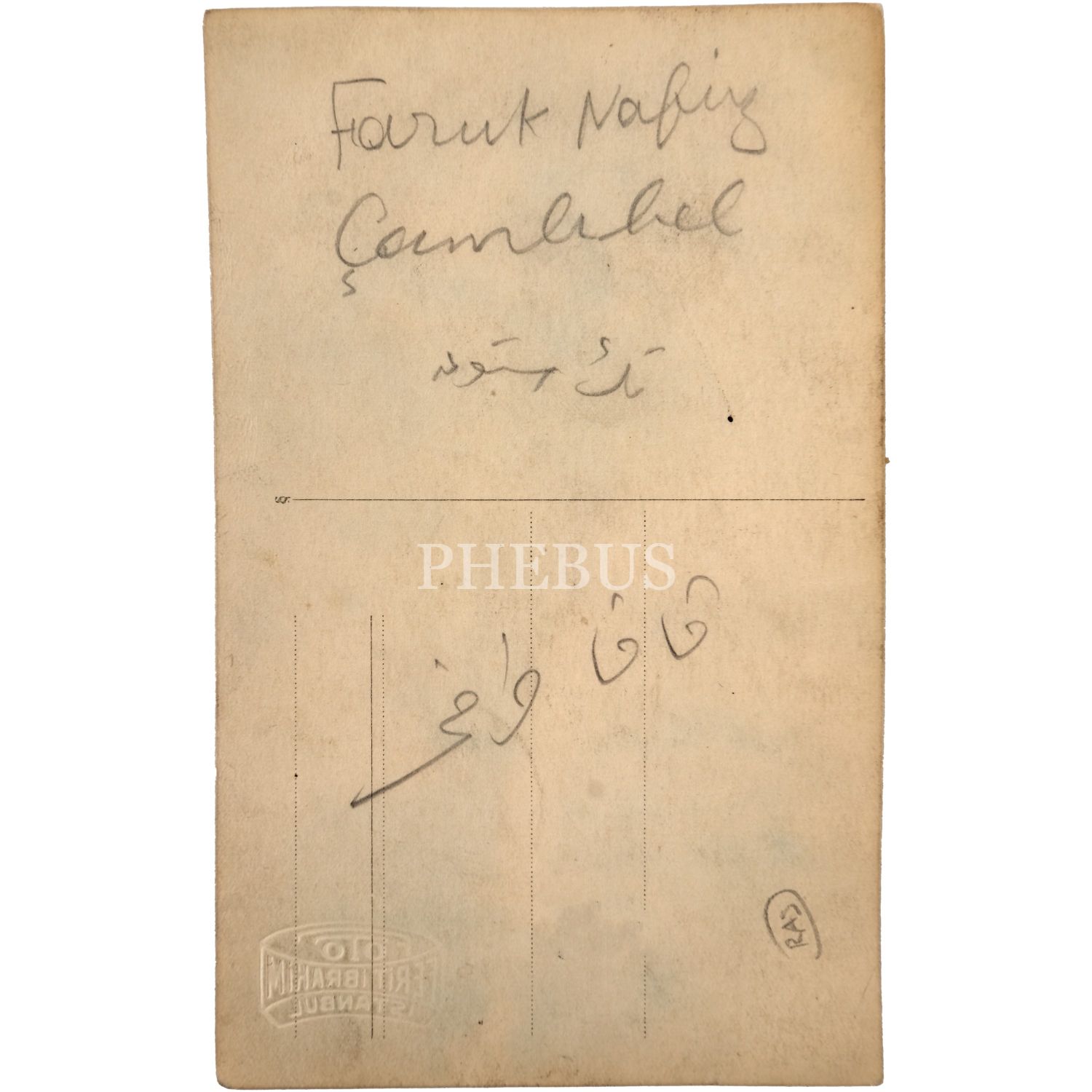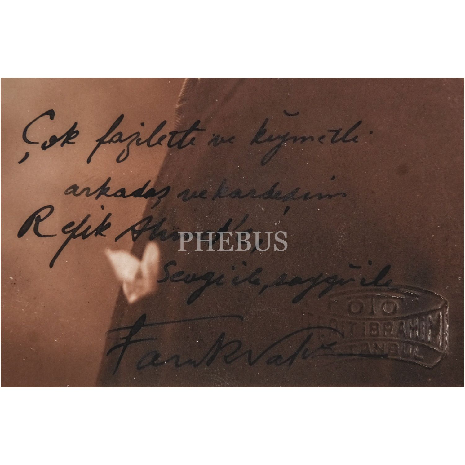 Beş Hececilerin en büyük şairi Faruk Nafiz Çamlıbel´den Refik Ahmet Sevengil´e ithaflı ve imzalı fotoğraf, "Foto Ferit İbrahim - İstanbul" soğuk damgalı, 9x14 cm...