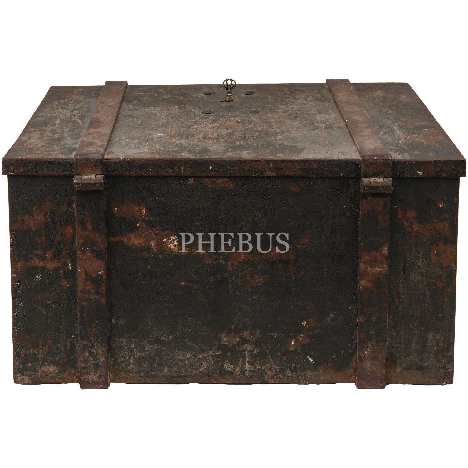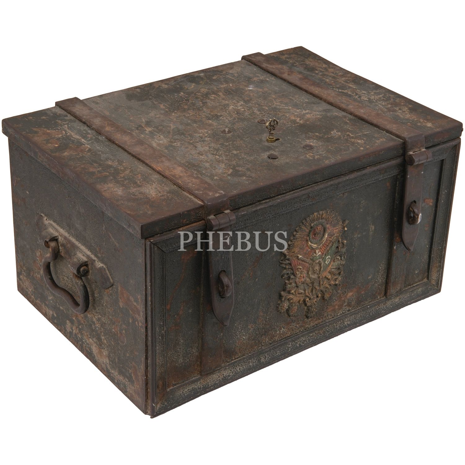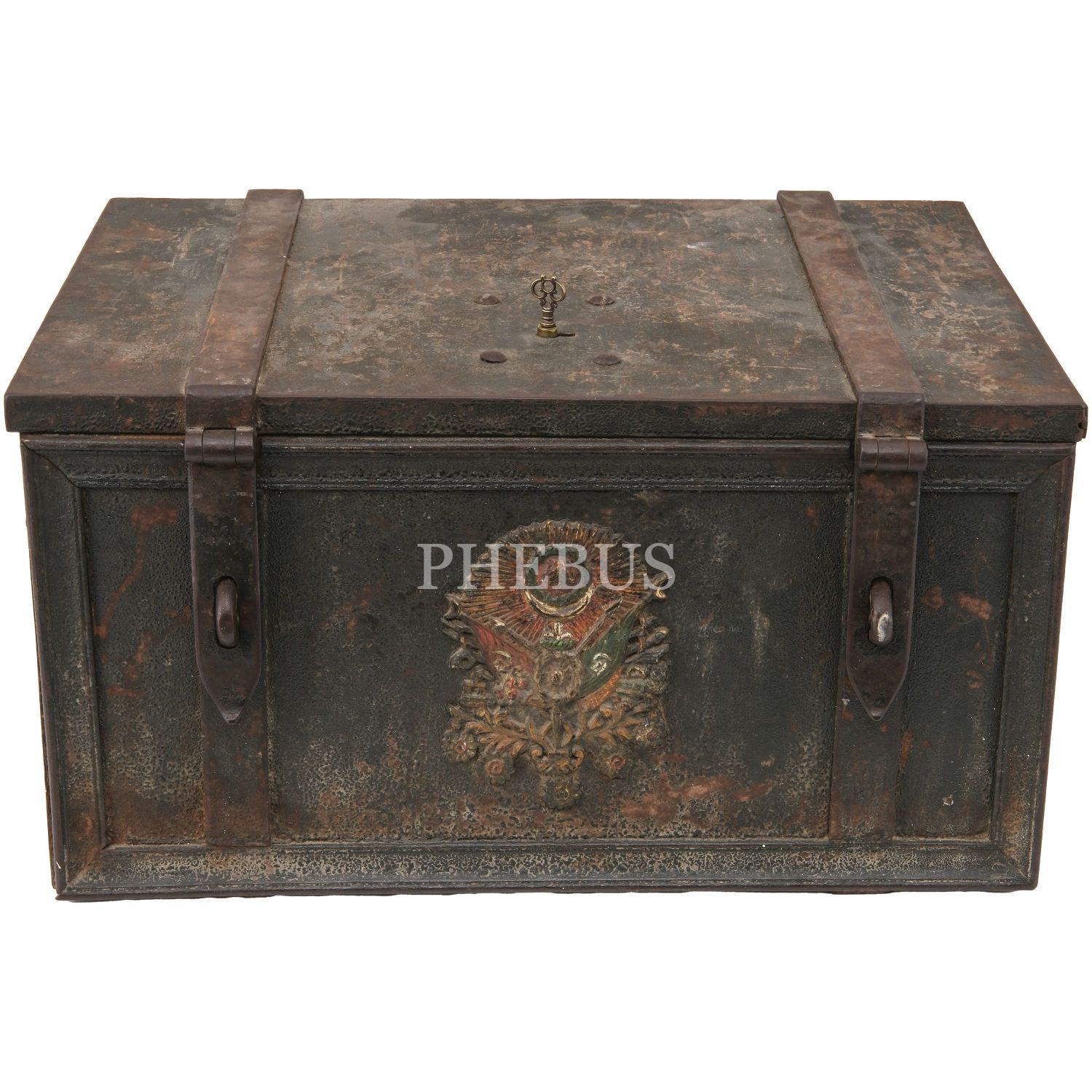 Ön yüzü Osmanlı Devlet Arması plakalı, kilit mekanizmalı (anahtarı mevcut) çelik sandık, 61x41x32 cm...