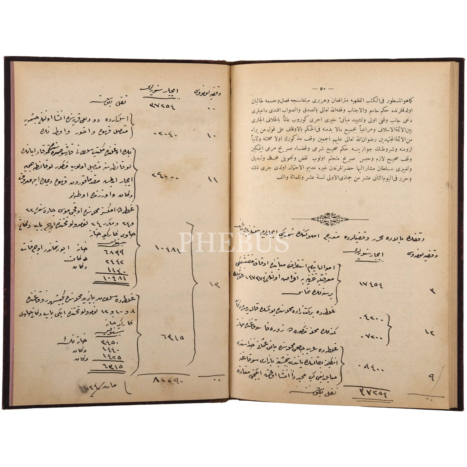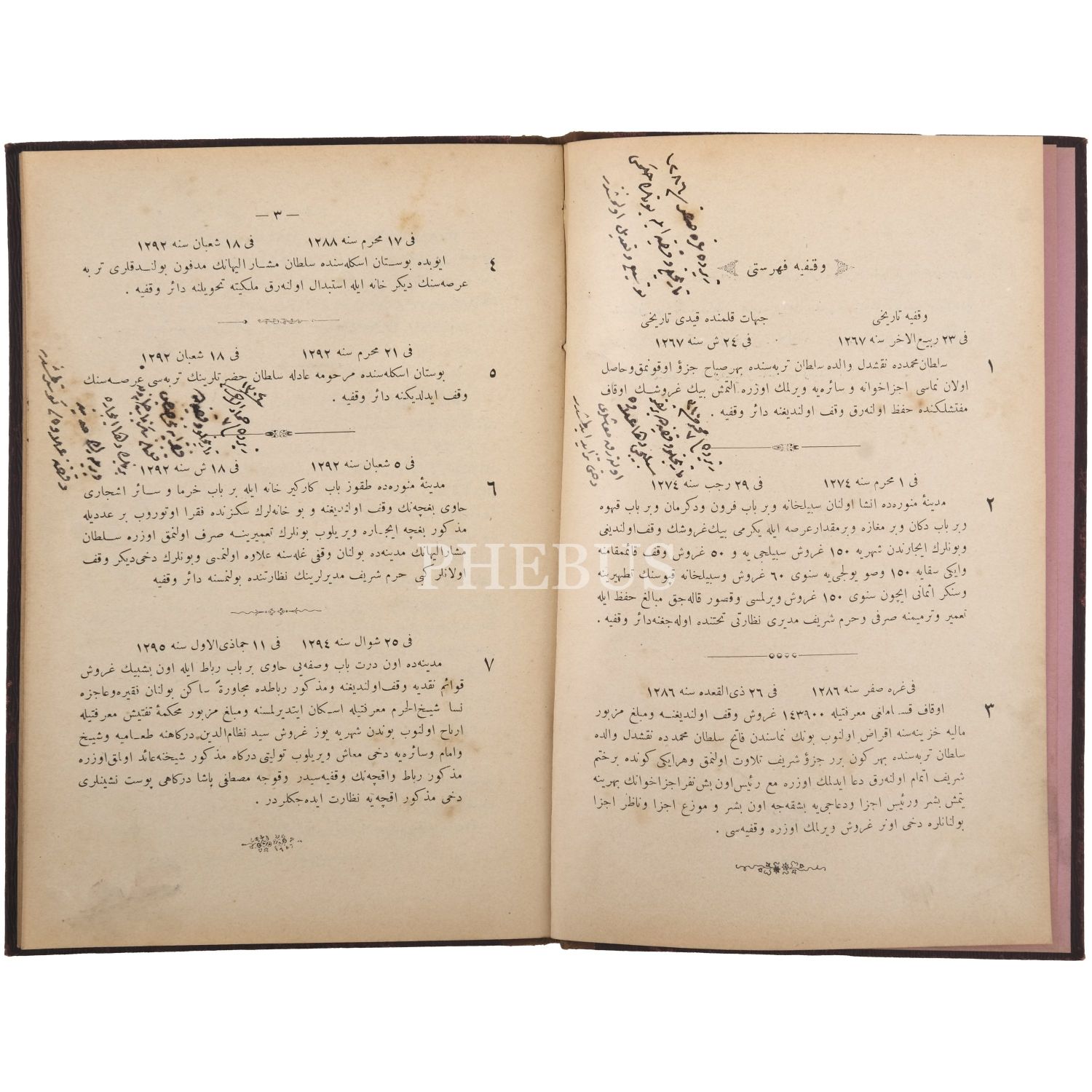 Sultan 2. Mahmud´un kızı Âdile Sultan´ın İstanbul ve Medine´deki vakfiyelerinin Evkâf-ı Hümâyun Nezâreti kalemindeki kayıtlarının suretlerini içeren matbu metin, 1320, Mahmud Bey Matbaası, 50+4 sayfa, 16x25 cm...