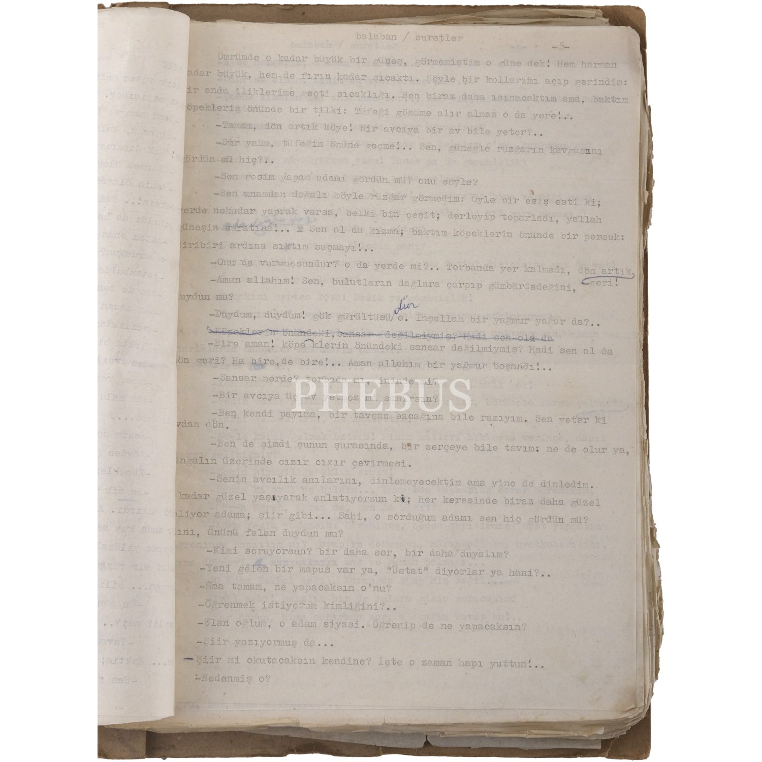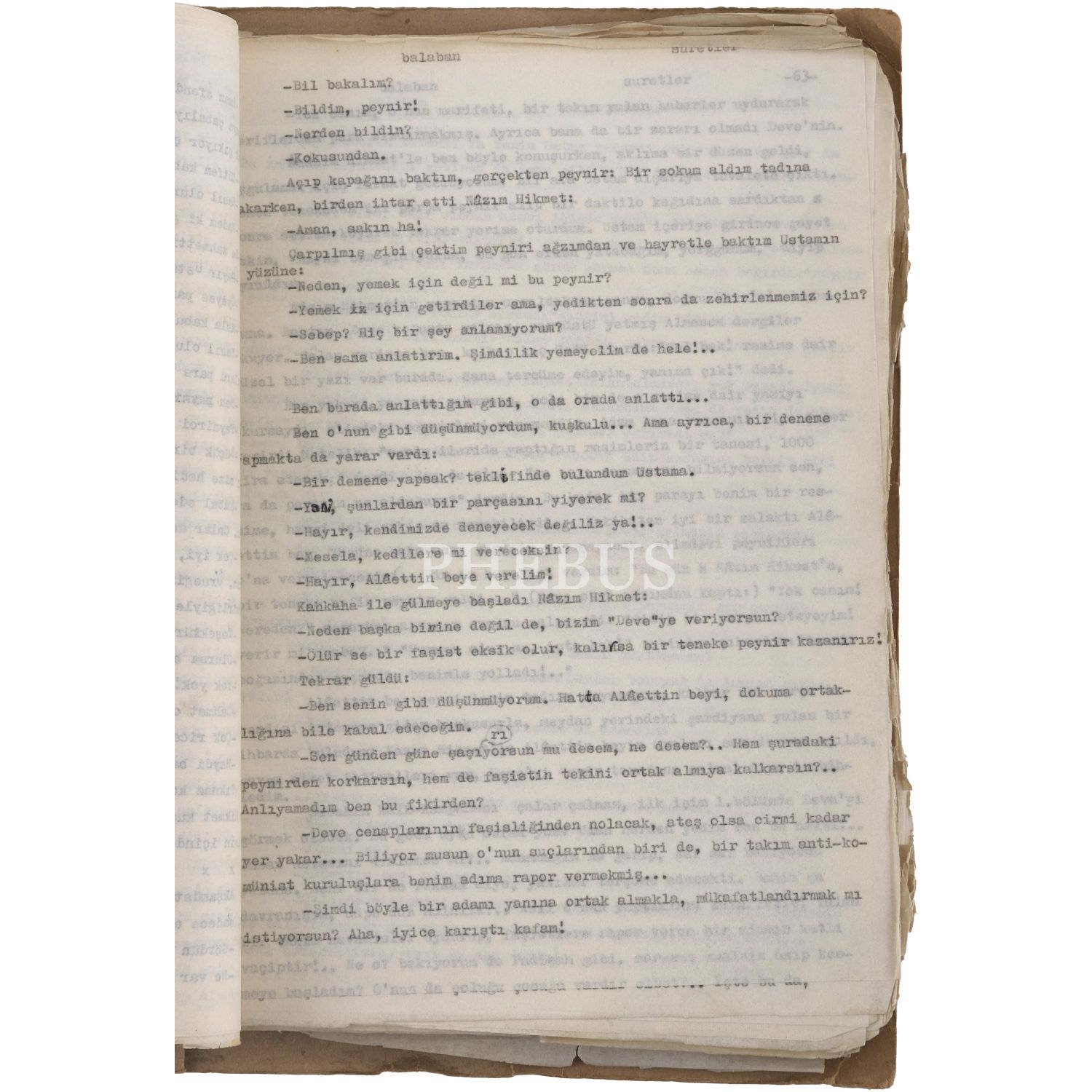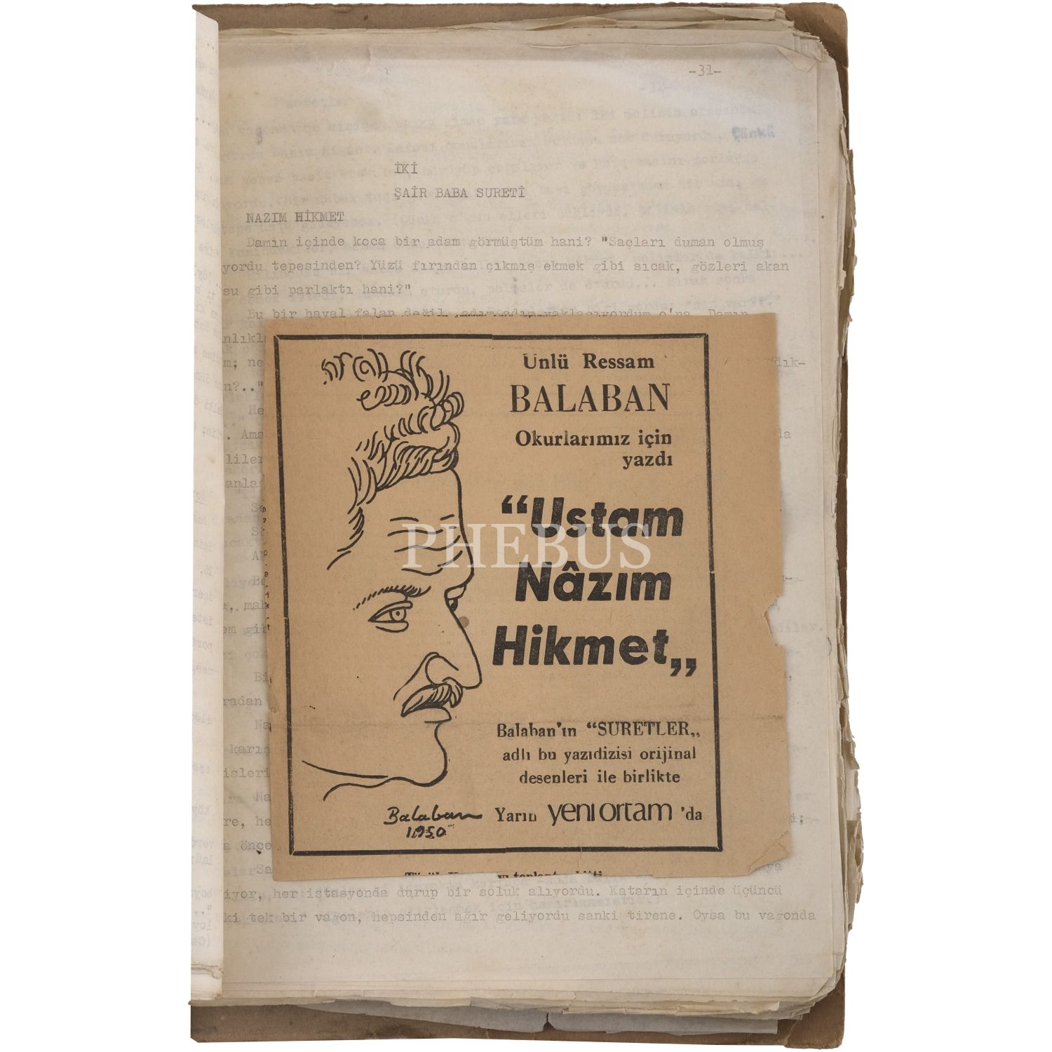 İbrahim Balaban´ın, Yeni Ortam´da yayımladığı, "Ustam Nâzım Hikmet" sloganlı "Suretler" adlı yazı dizisinin orijinal daktilo metinleri, Balaban´ın düzelti notlarıyla, 267 sayfa, 23x33 cm...