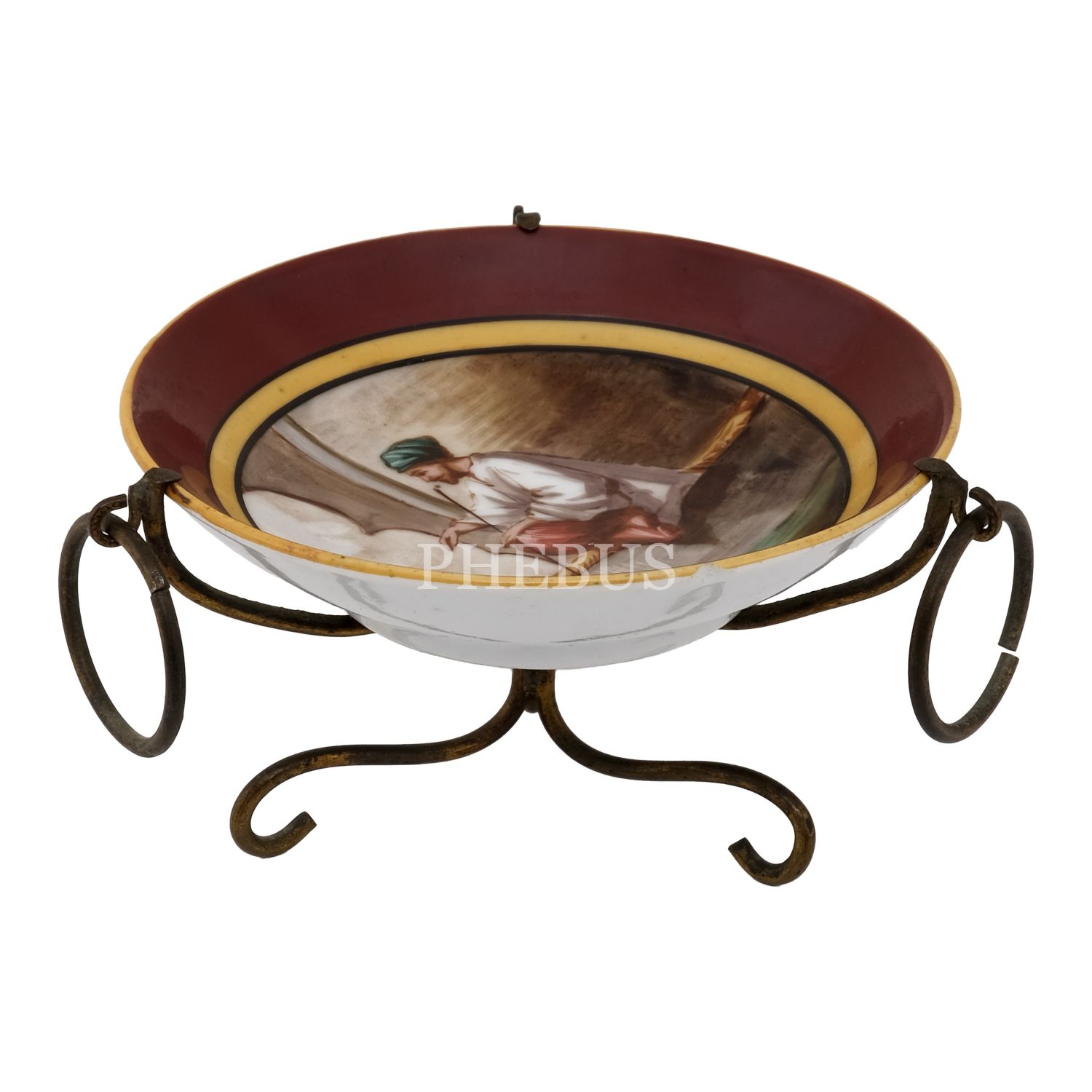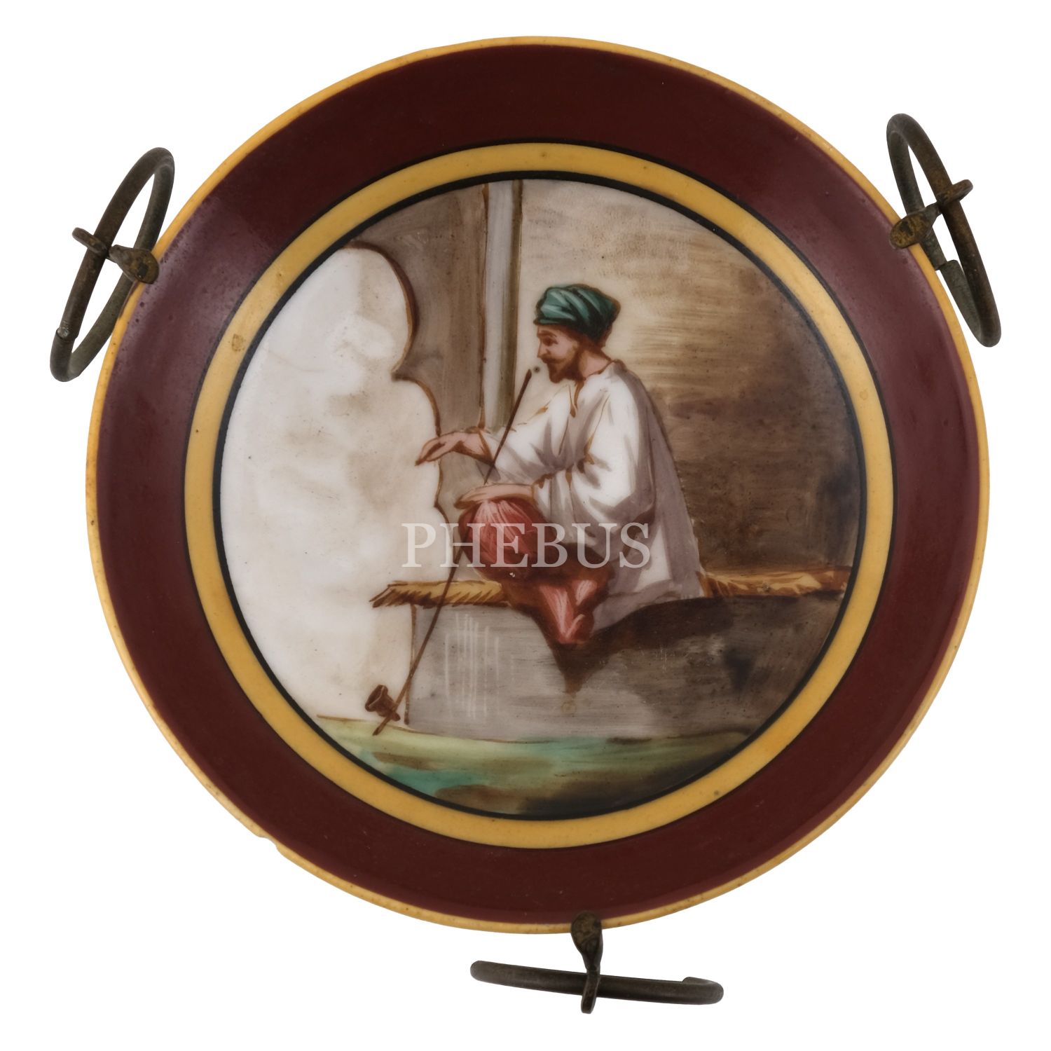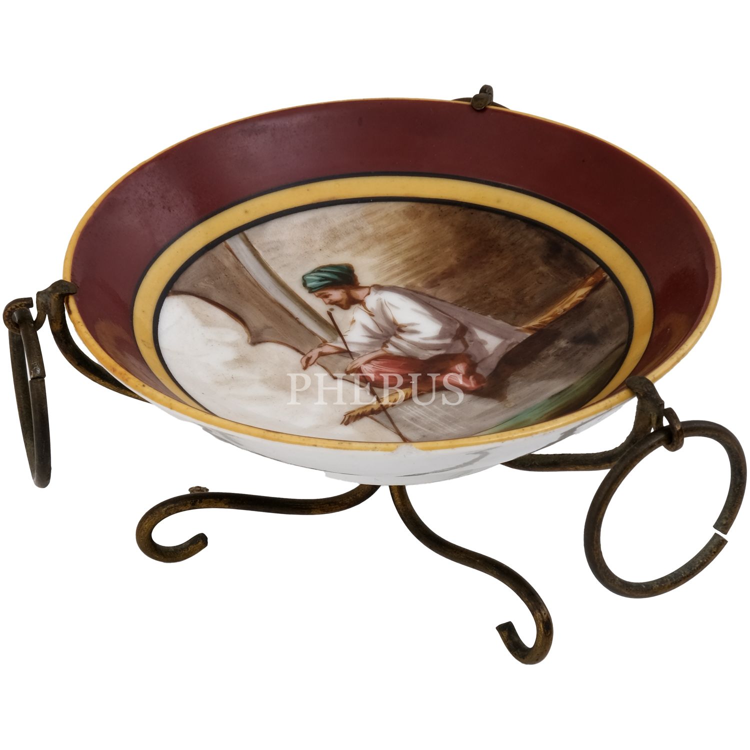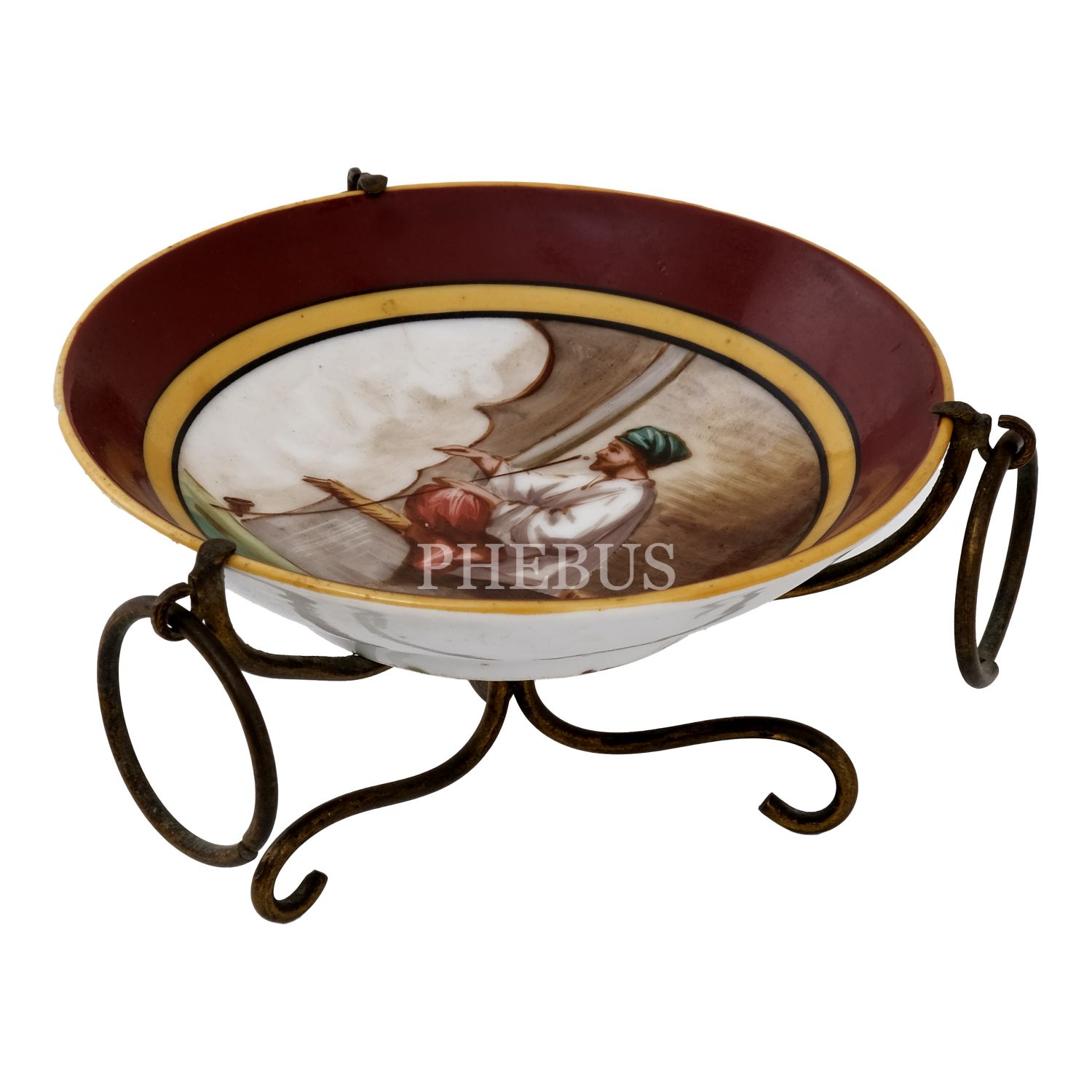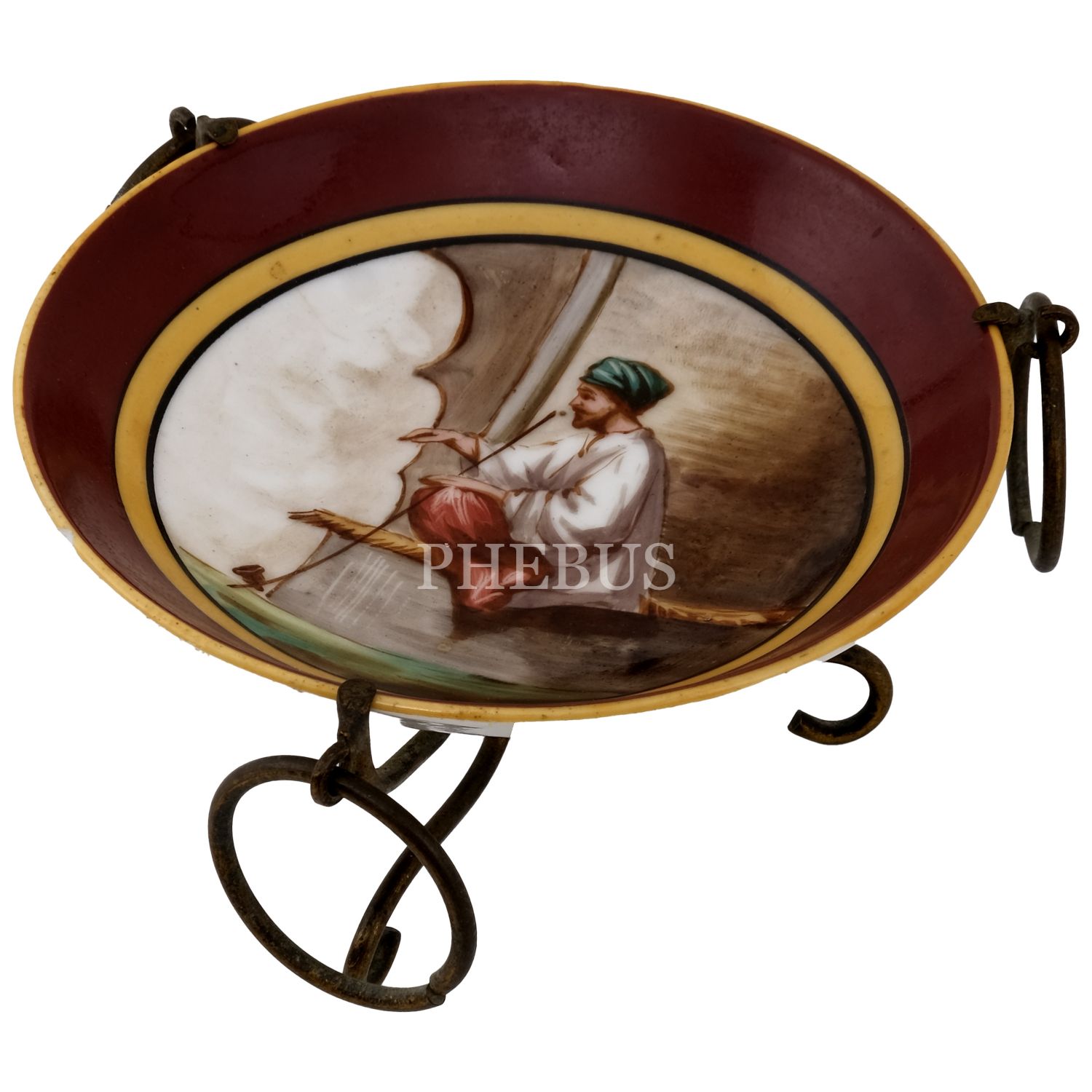 Merkezi tütün çubuklu oryantal figür görselli tabak, üç kenarı halkalı, metal ayaklı standa monte edilmiş, 11x6,5 cm...