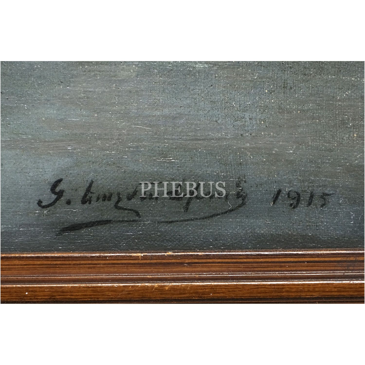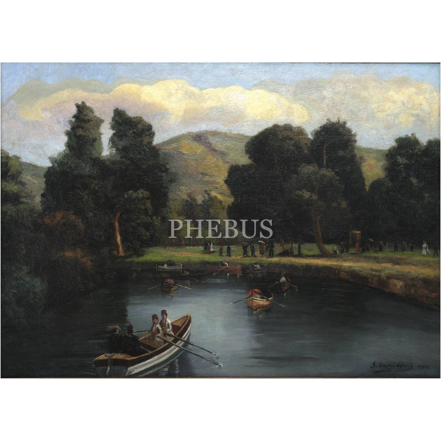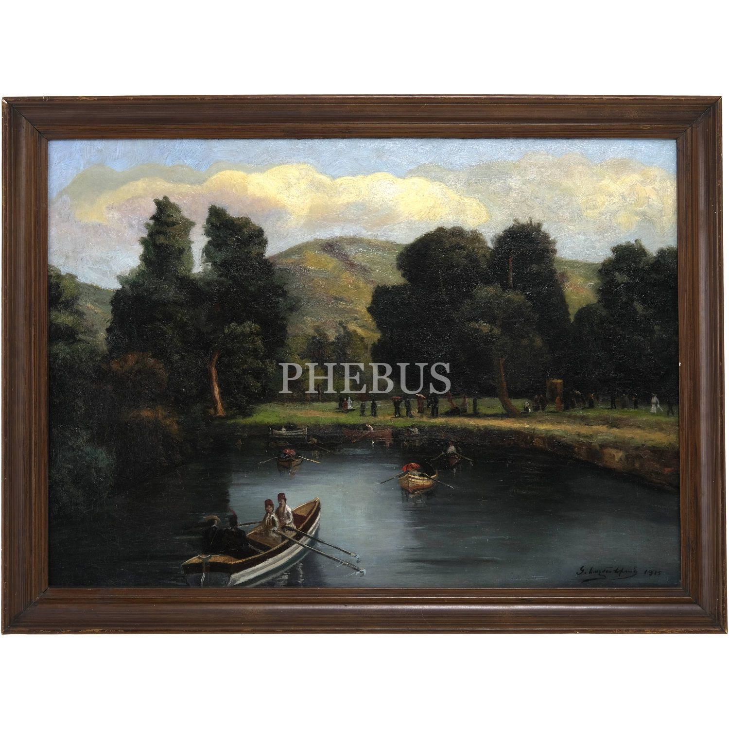 Garabet Yazmaciyan imzalı, Kağıthane Deresi´nde kayığa binen Osmanlıların resmedildiği 1915 tarihli tuval üzerine yağlı boya tablo, 69x49 cm...