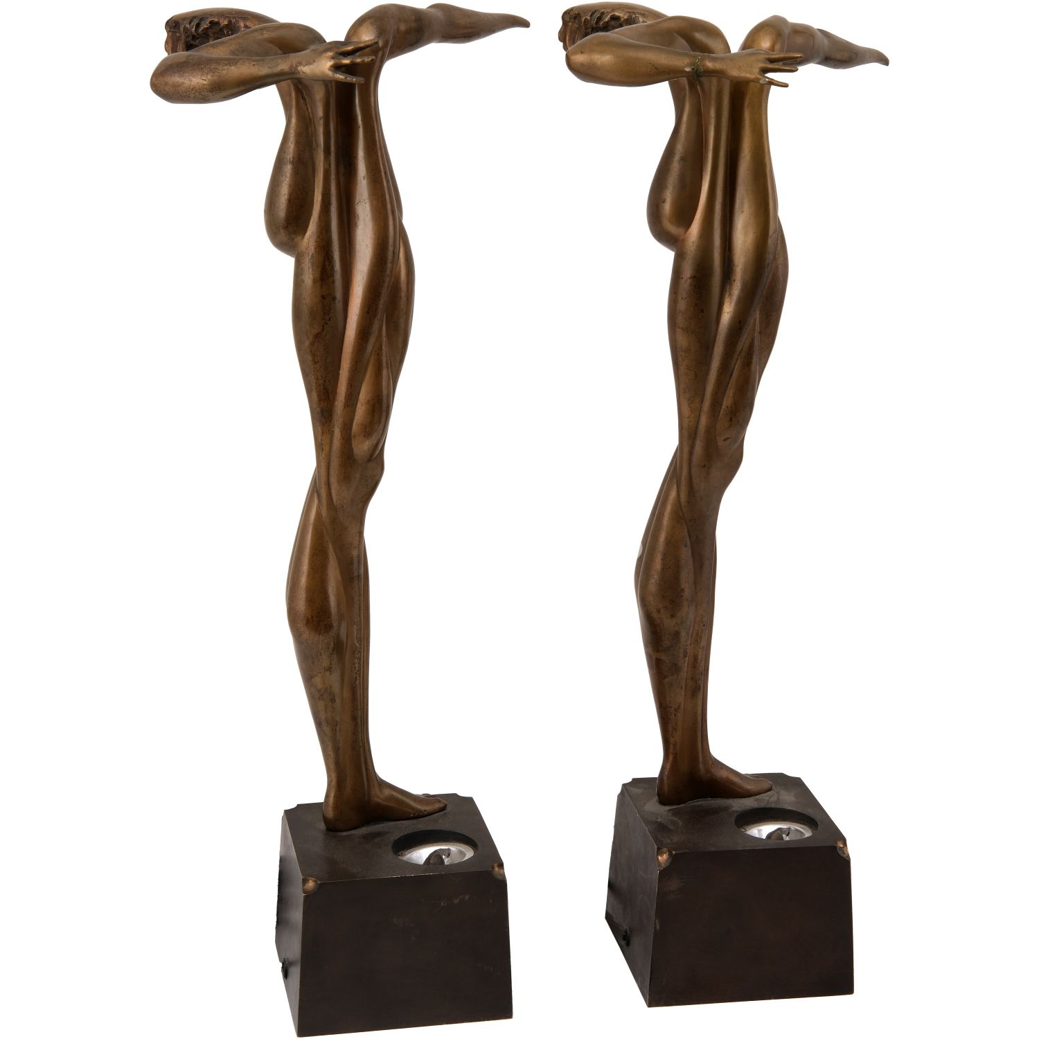 İtalya merkezli sanatsal bronz dekoratif eser üreticisi Venturi Arte Bologne üretimi, soyut insan bedeni formunda, kaideleri aydınlatma aplikeli bir çift sınırlı üretim bronz heykel-lamba, imzalı ve damgalı, 3/99 ve 5/99 edisyon, 55x32x13 cm...