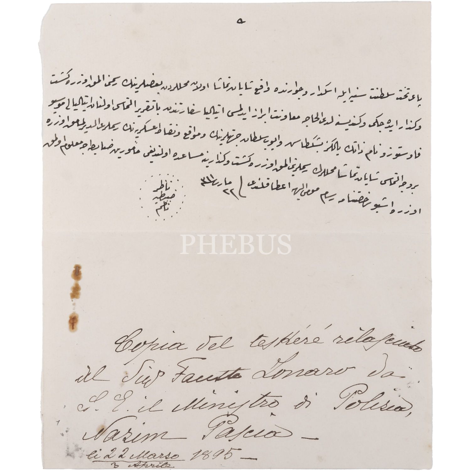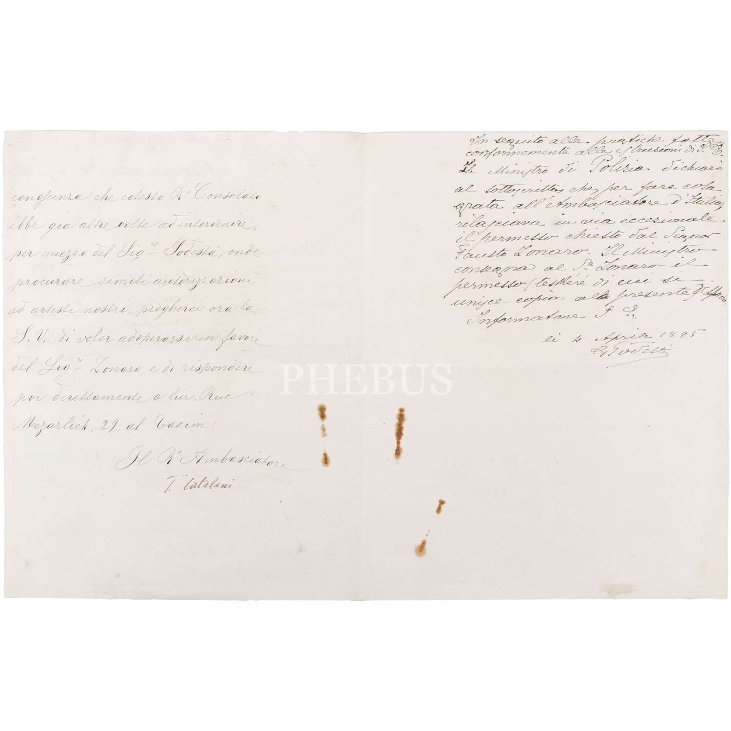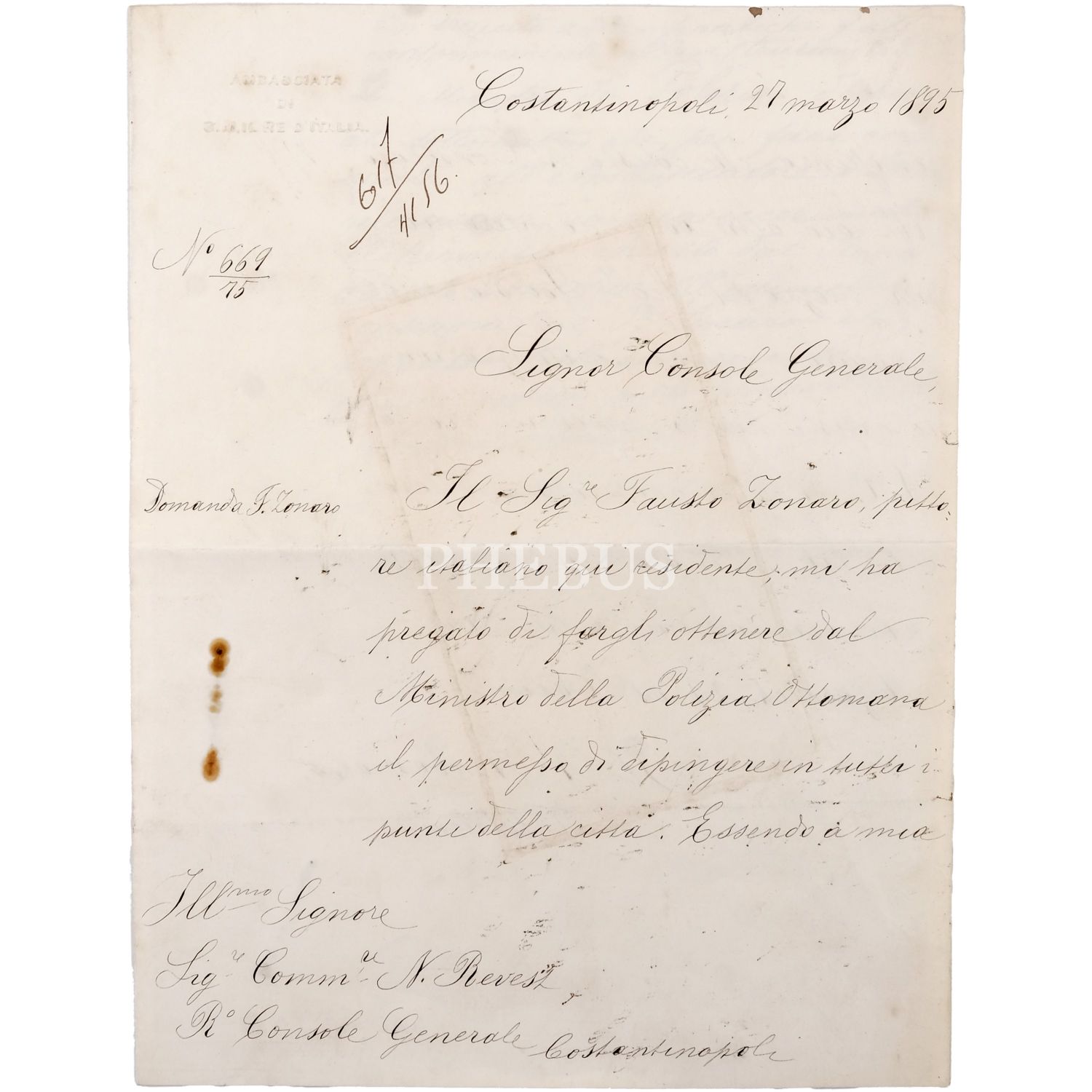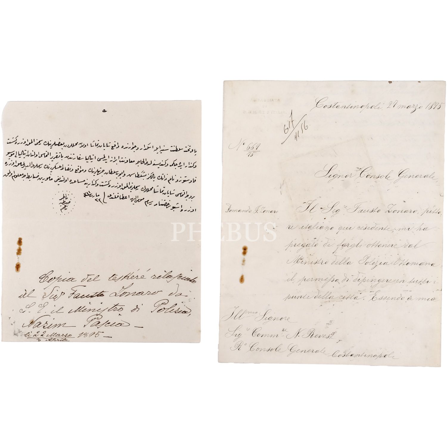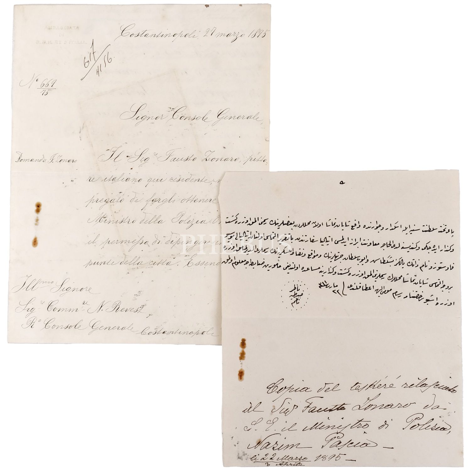 Osmanlı´nın son saray ressamı olarak bilinen Fausto Zonaro´nun Üsküdar, Beşiktaş ve Eyüpsultan civarındaki mahallelerde manzara resimleri çizmesine müsaade edilmesi için İtalyan Büyükelçiliği tarafından yazılan dilekçe ve bu dilekçeye cevap olarak Nazır Nazım Paşa´nın kaleme aldığı dilekçe, İtalyan Büyükelçiliği dilekçesi 21x27 cm, Nazır Nazım Paşa´nın cevabı 19x23 cm...