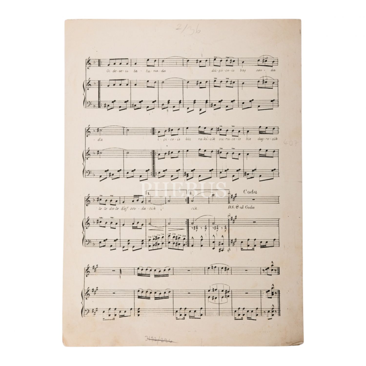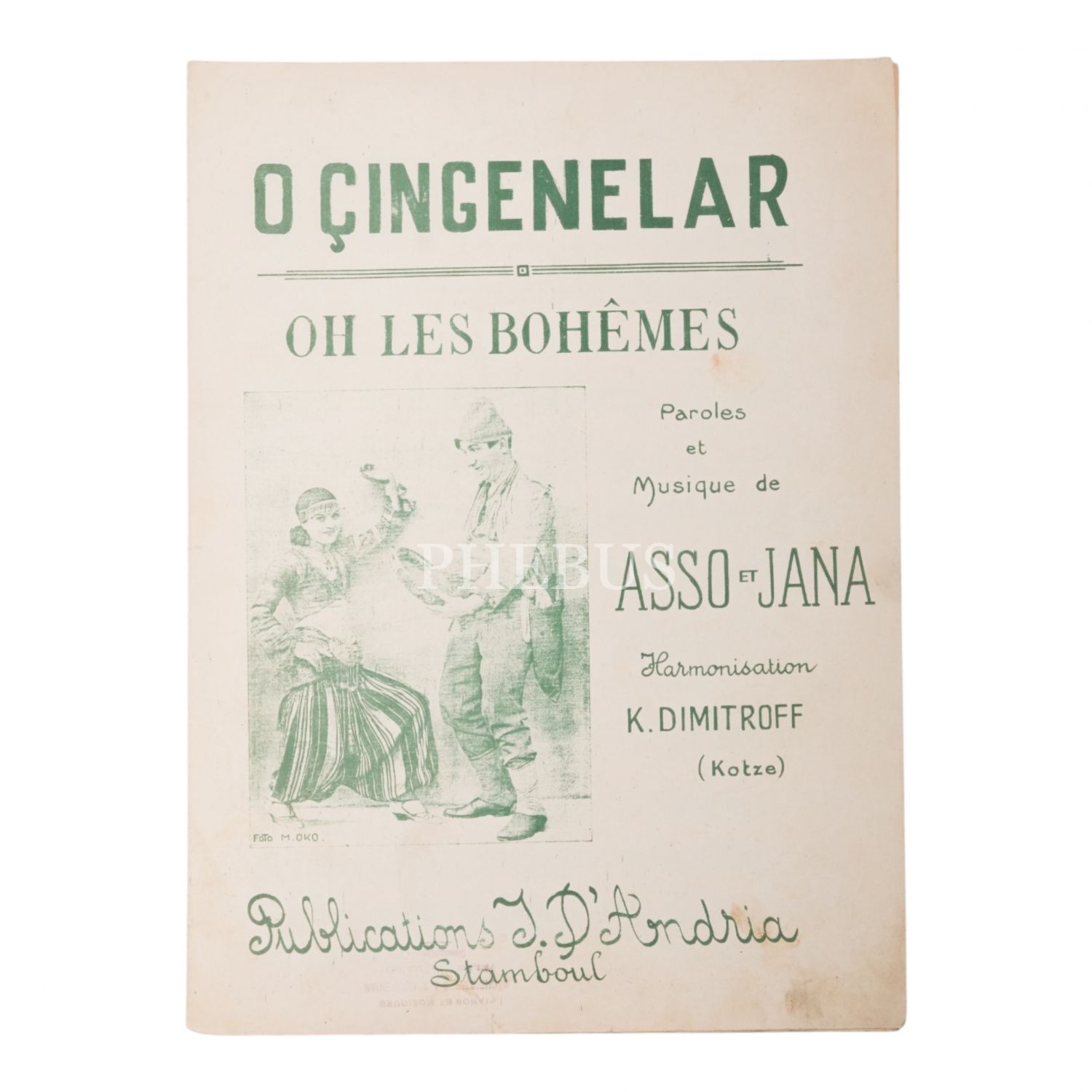 “O Çingeneler” (Oh Les Bohêmes) şarkısının notası, söz ve müzik: Asso ile Jeanne, armonizasyon K. Dimitroff (Kotze), 1931, "Publications d´Andria - Galata, Stamboul), 4 sayfa, 25x34 cm...
