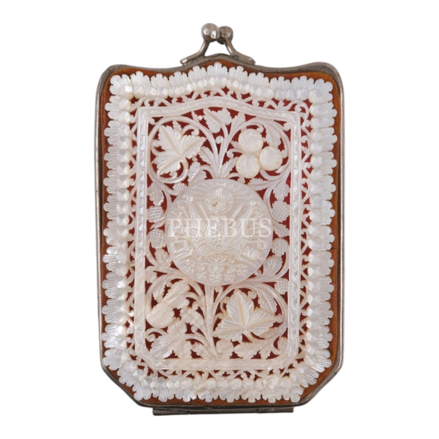 Bir yüzünde yekpare sedeften oyularak Osmanlı Devlet arması işlenmiş, diğer yüzünde yine yekpare bir sedeften oyularak Mescid-i Aksa görseli işlenmiş cüzdan, 6x9 cm...