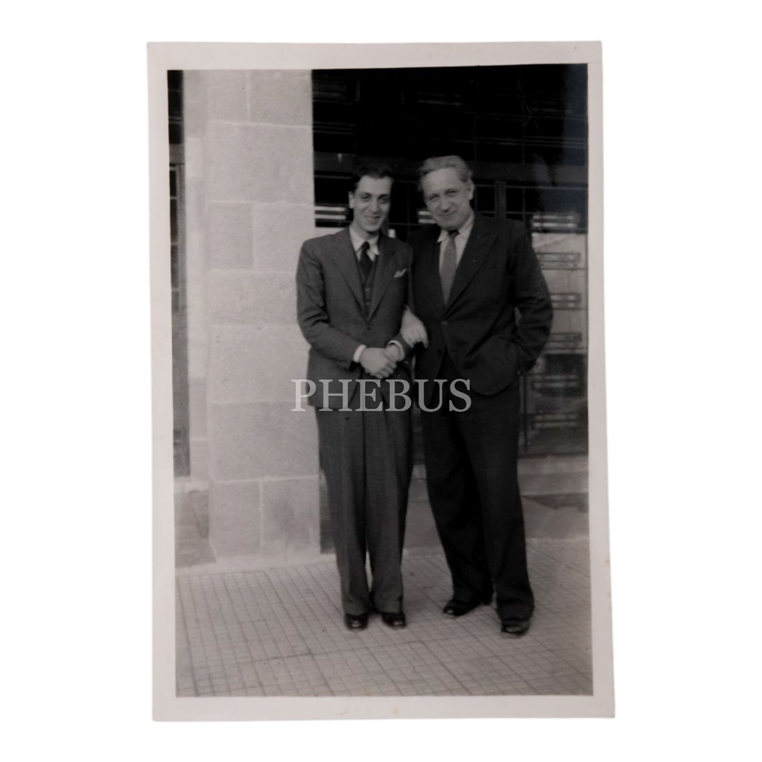 Modern Türk tiyatrosunun kurucularından Carl Ebert ve Bedrettin Tuncel´in, Ankara Devlet Konservatuvarı önünde çekilmiş hatıra fotoğrafı, 6x9 cm...
