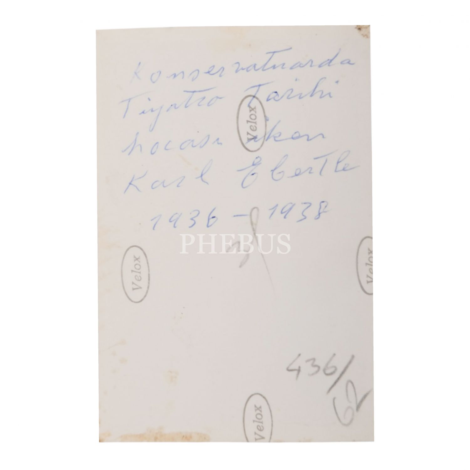 Fotoğrafın arka yüzüne Bedrettin Tuncel tarafından el yazısıyla şu not düşülmüştür: "Konservatuarda Tiyatro Tarihi hocası iken Karl Ebertle 1936-1938"