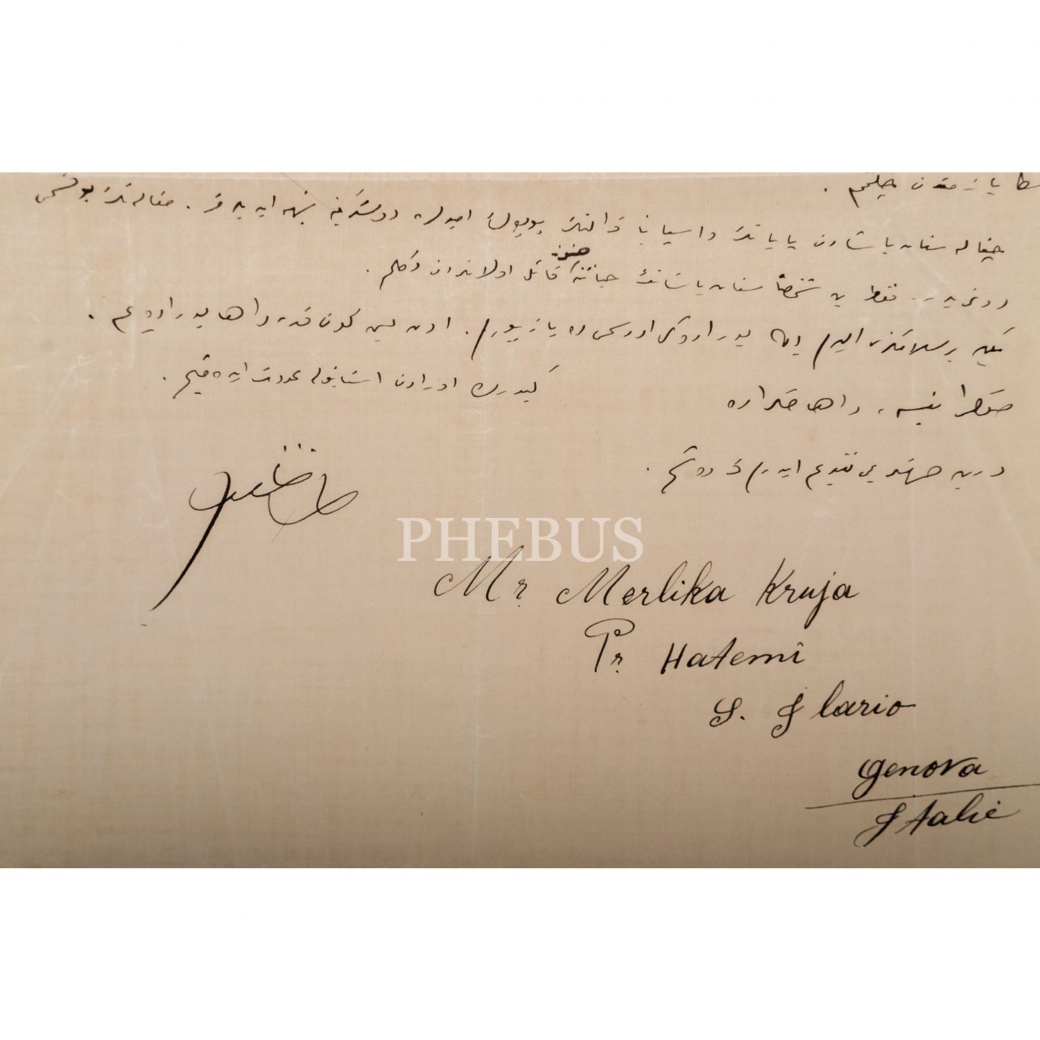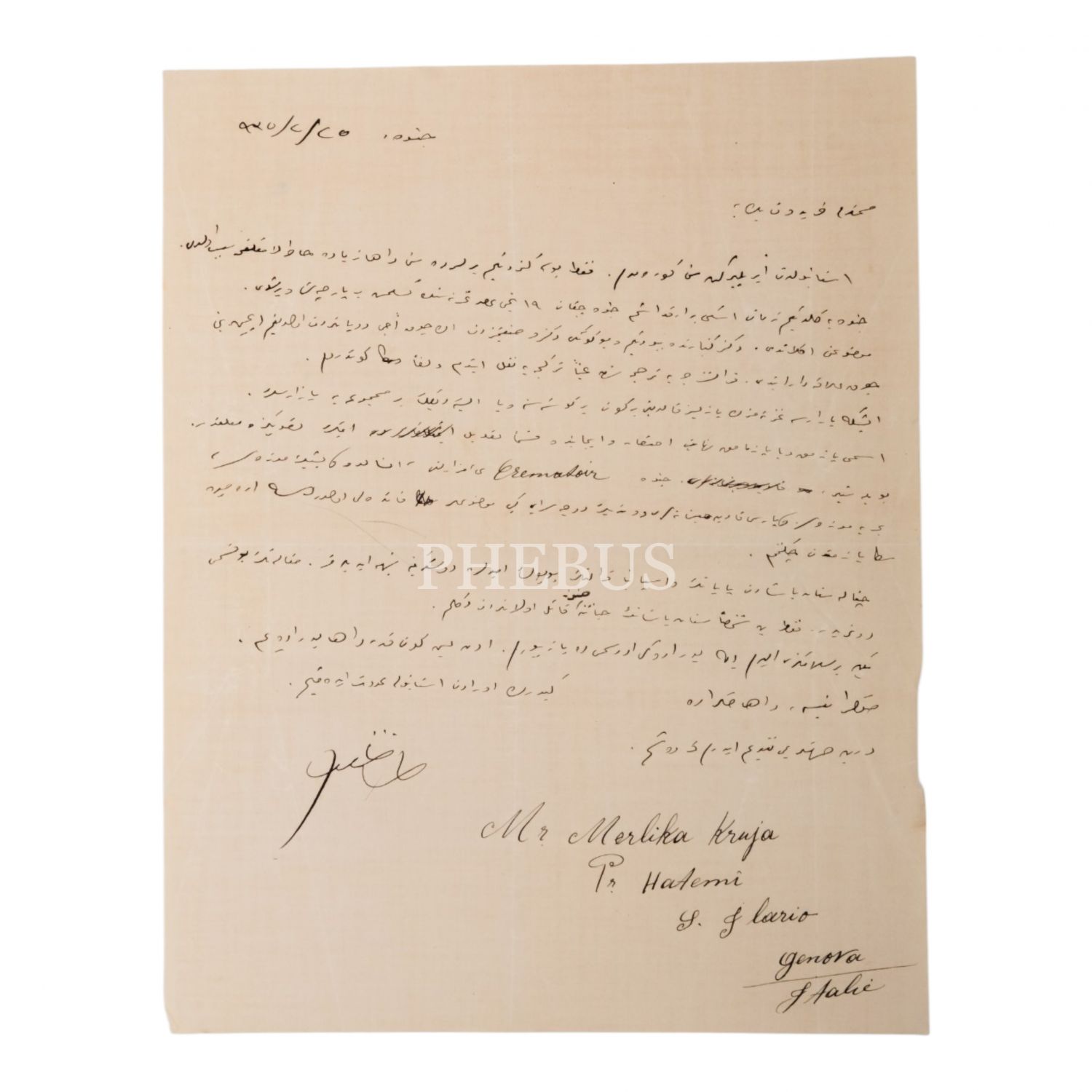 Osmanlı´da Maarif Nazırlığı bünyesinde danışman olarak görev yapmış, Arnavutluk Başbakanlarından Mustafa Merlika Kruja´nın el yazısıyla kaleme alıp imzaladığı mektubu, 25 Şubat 1935, 22x28 cm...