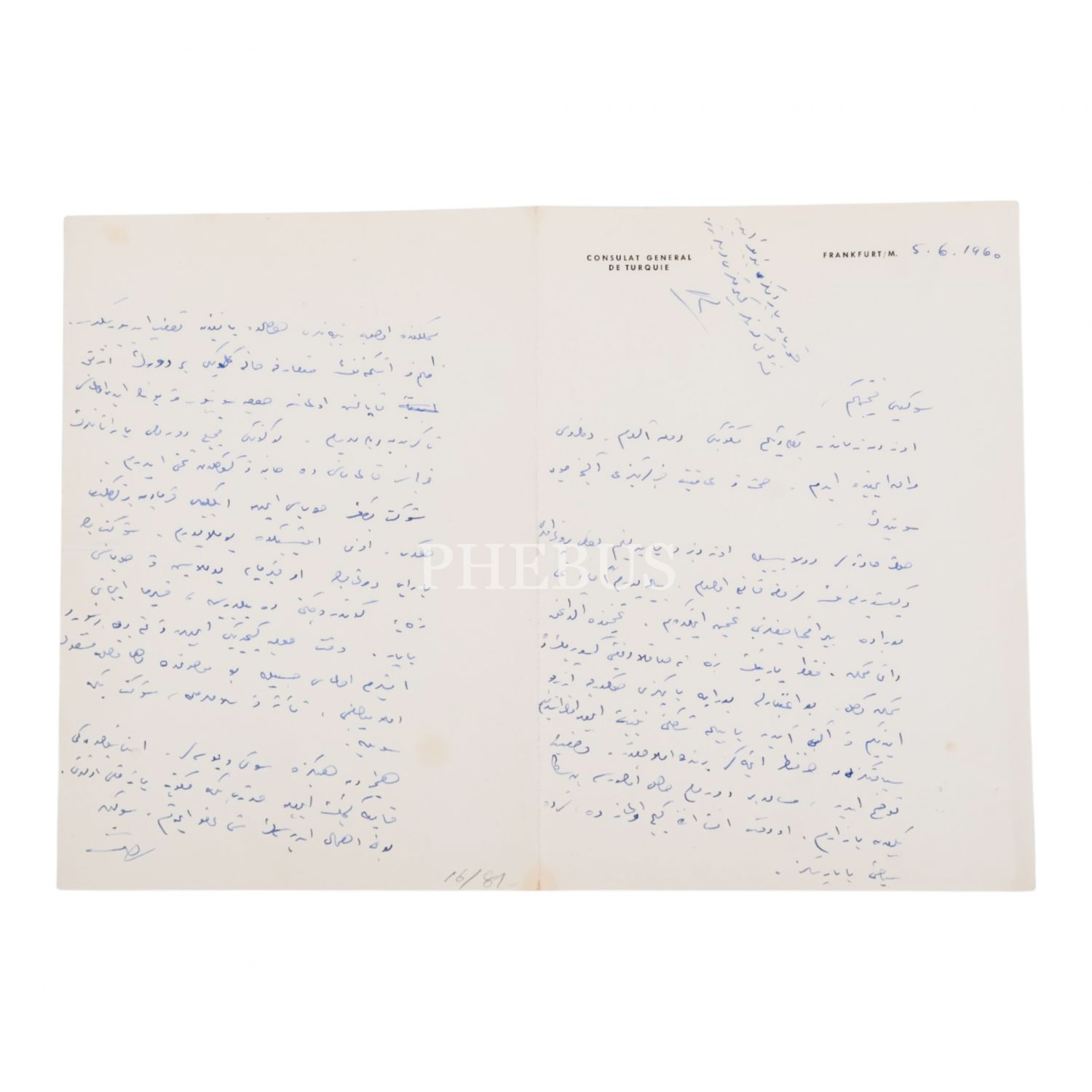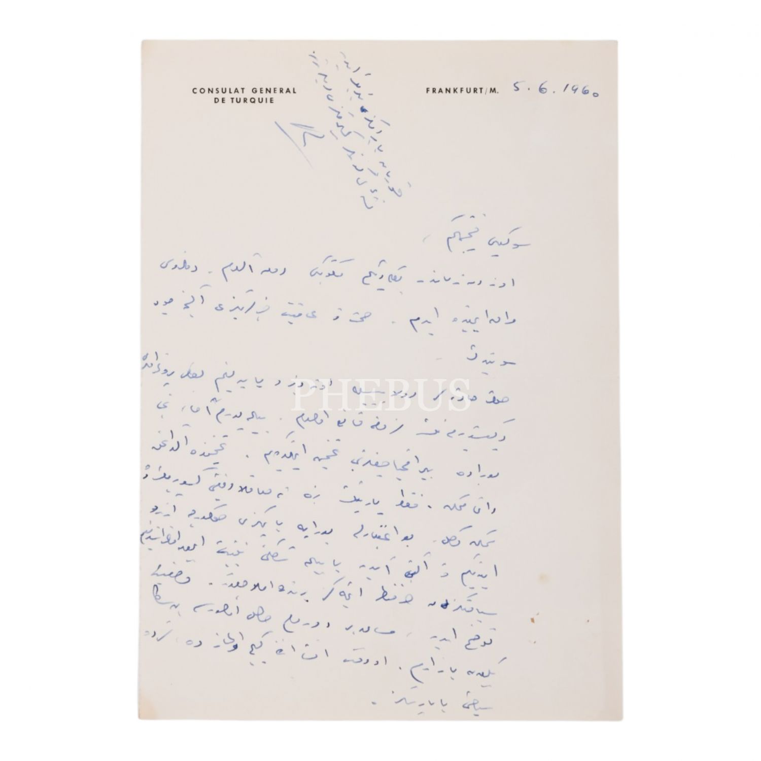 Frankfurt Başkonsolosu Rıfat Ayanlar´ın, "Consulat General de Turquie" antetli kağıda kaleme alıp imzaladığı mektubu, 1960, 15x21 cm...