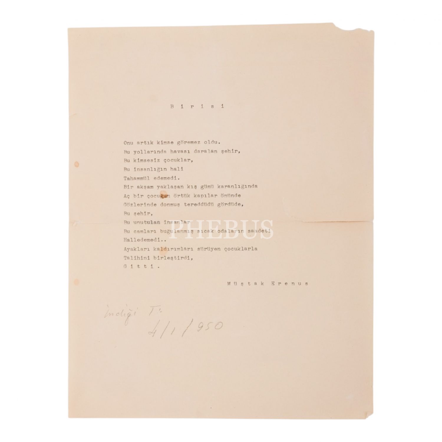 Müştak Erenus´un "Birisi" adlı şiirinin, bir sergide teşhir edilmiş daktilo metni, 23x30 cm...