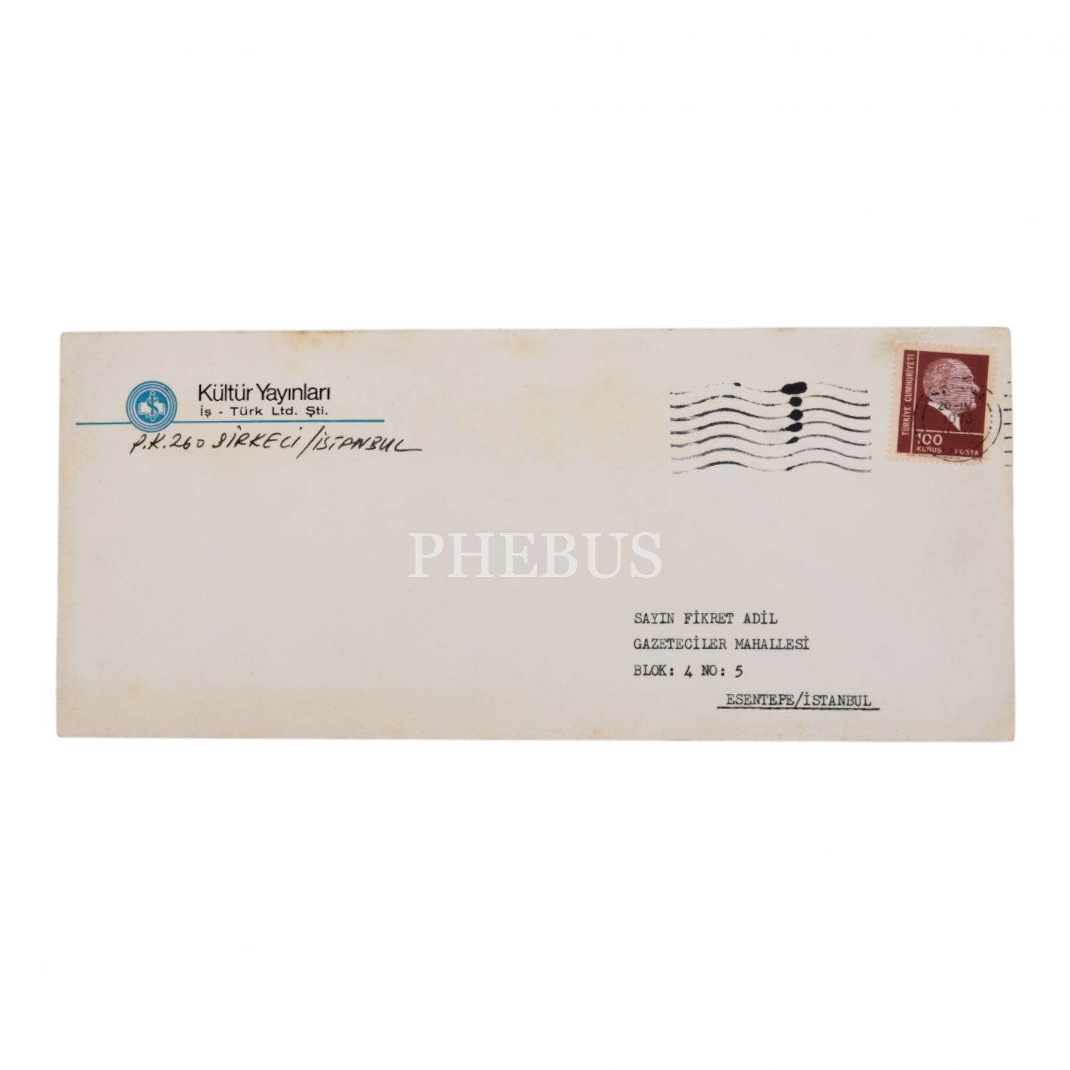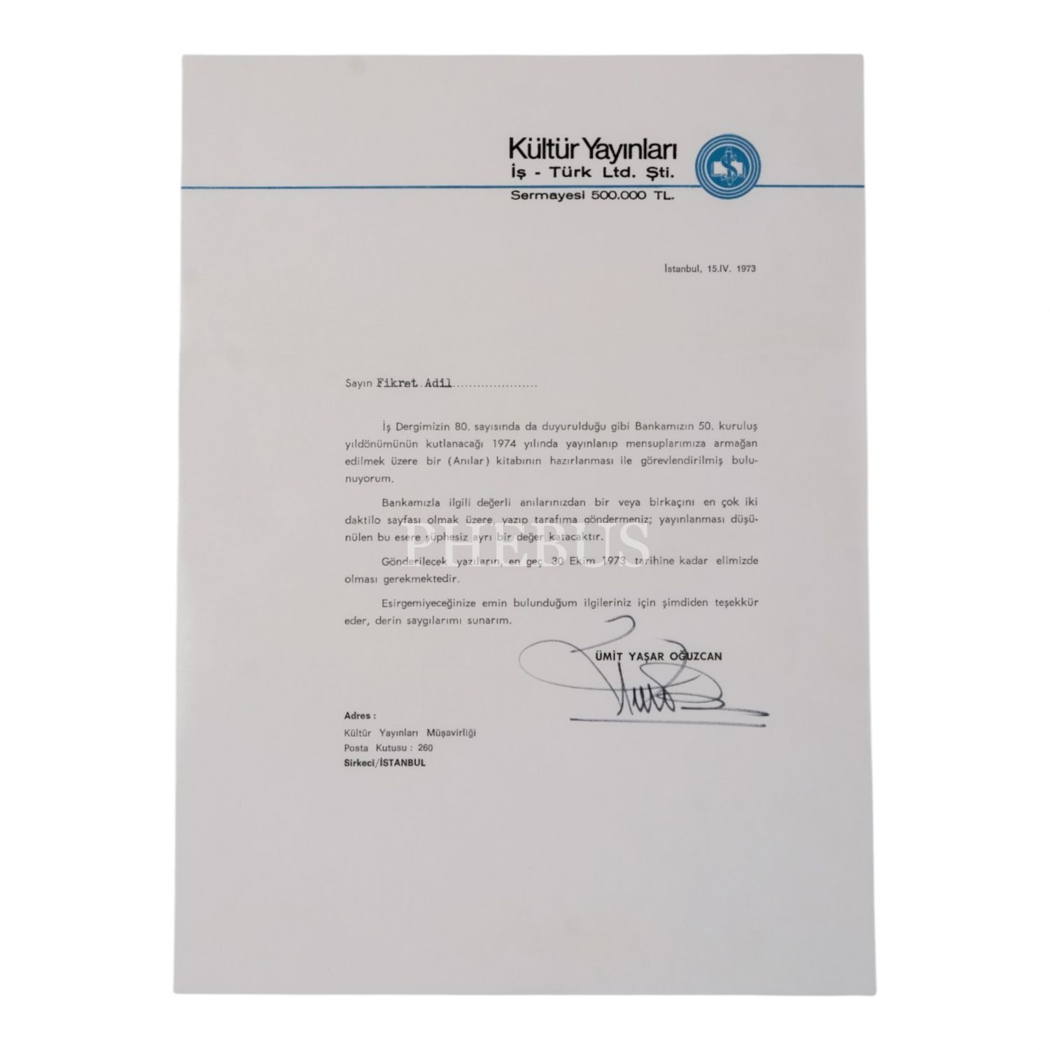 Ümit Yaşar Oğuzcan´dan Fikret Adil´e gönderilmiş, ıslak imzalı daktilo mektup ve zarfı, 15 Nisan 1973, 21x29 cm...