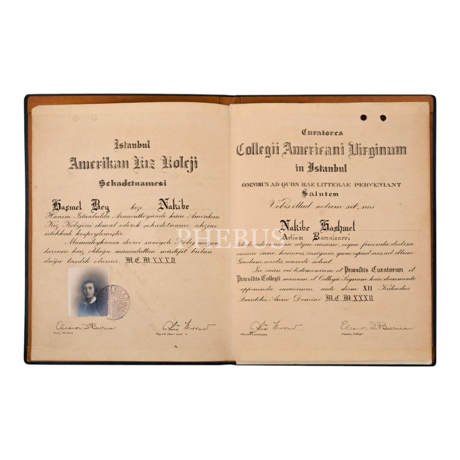 Türkiye´nin ilk matematiksel istatistikçisi olan Nakibe Topuz Uzgören´in terekesinden, kendisine ait özel fotoğraf albümü ve lise diploması, 60 adet fotoğraf, 36x25 cm...