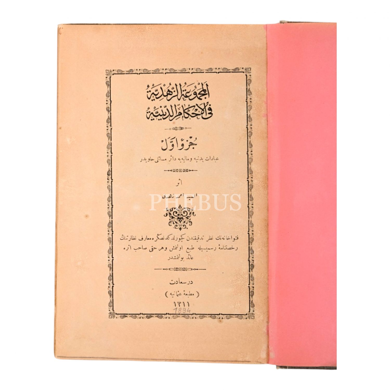 ELMECMÛATÜ´Z-ZÜHDİYE Fİ´L-AHKÂMİ´D-DÎNİYE (1 ve 2. Cilt), Ahmed Zühdü Paşa, 1311, Matbaa-i Osmâniye, 318+115 sayfa, 16x23 cm...