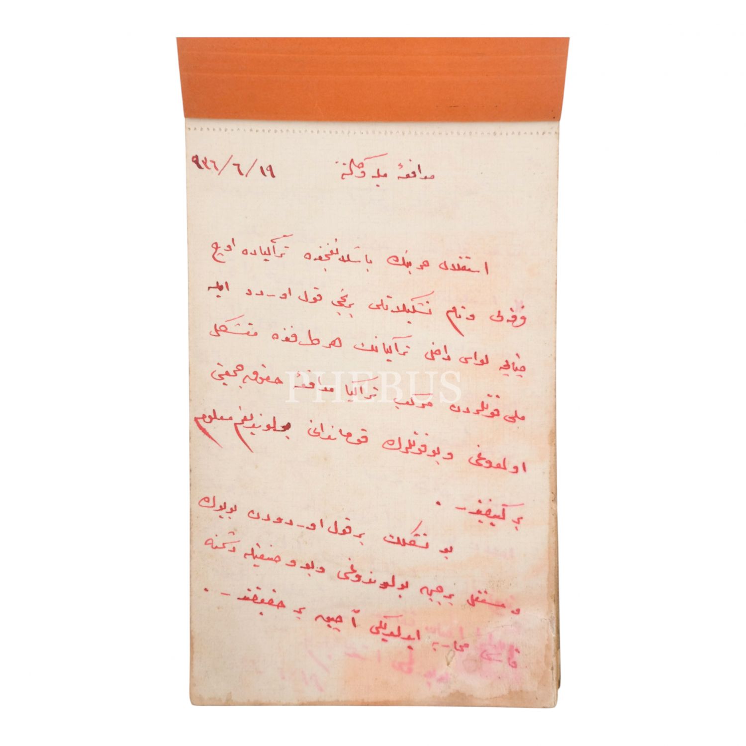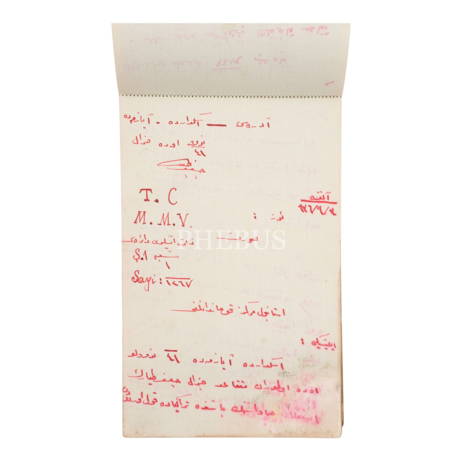 Cafer Tayyar Eğilmez´in, Cephe Kumandanlığı yaptığı için emekli maaşının yükseltilmesiyle alakalı, Milli Müdafaa Vekaleti ile yaptığı yazışmaların suretlerini bir araya getirdiği, en son sayfasında ıslak imzasının yer aldığı defteri, 19x11 cm...