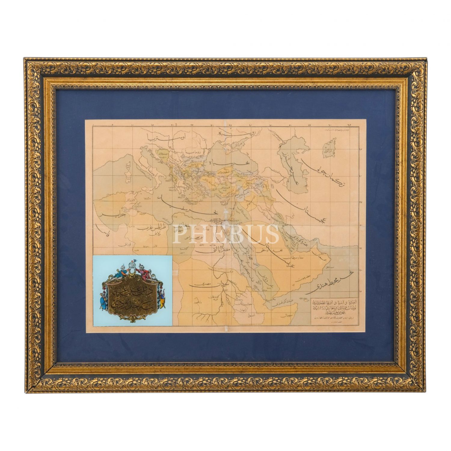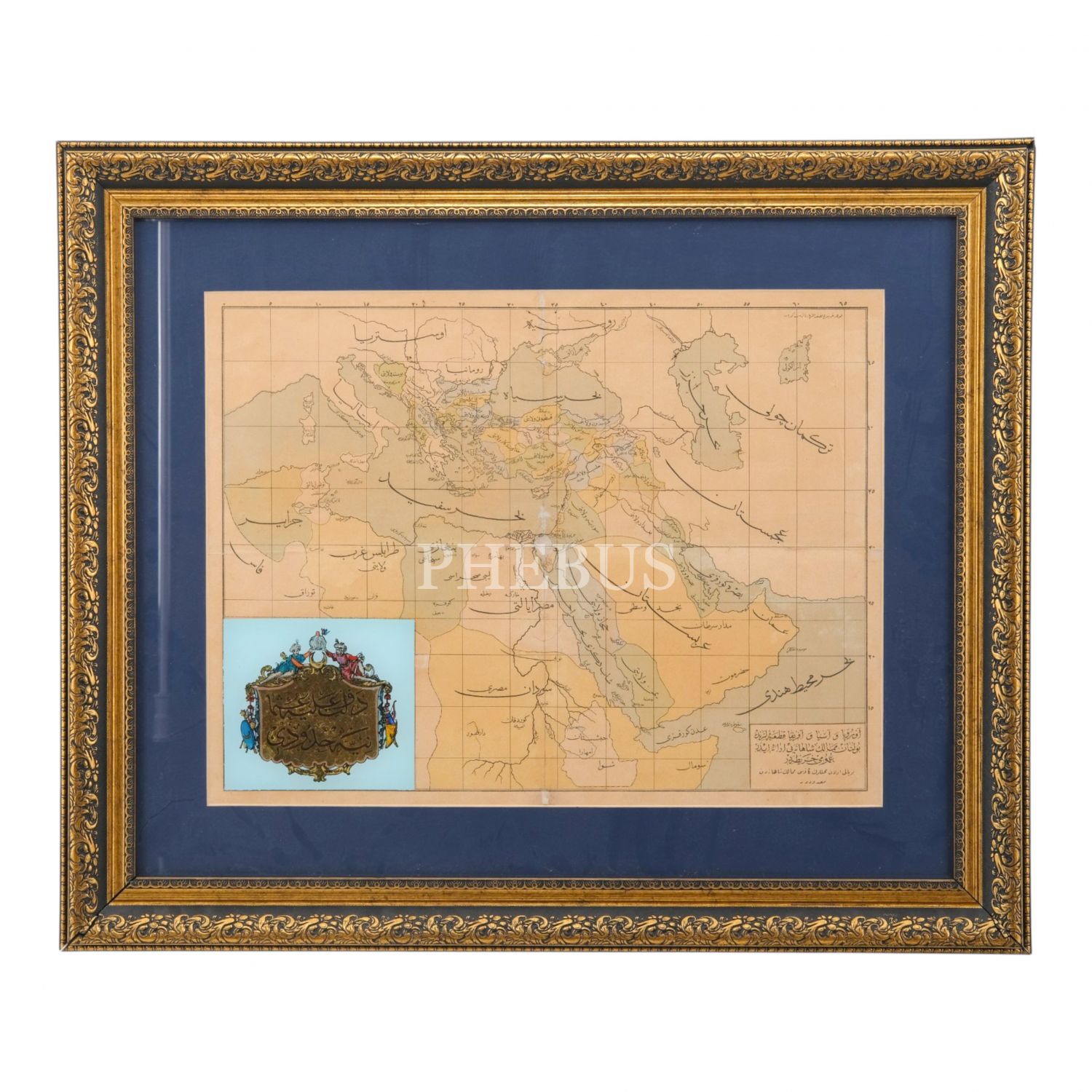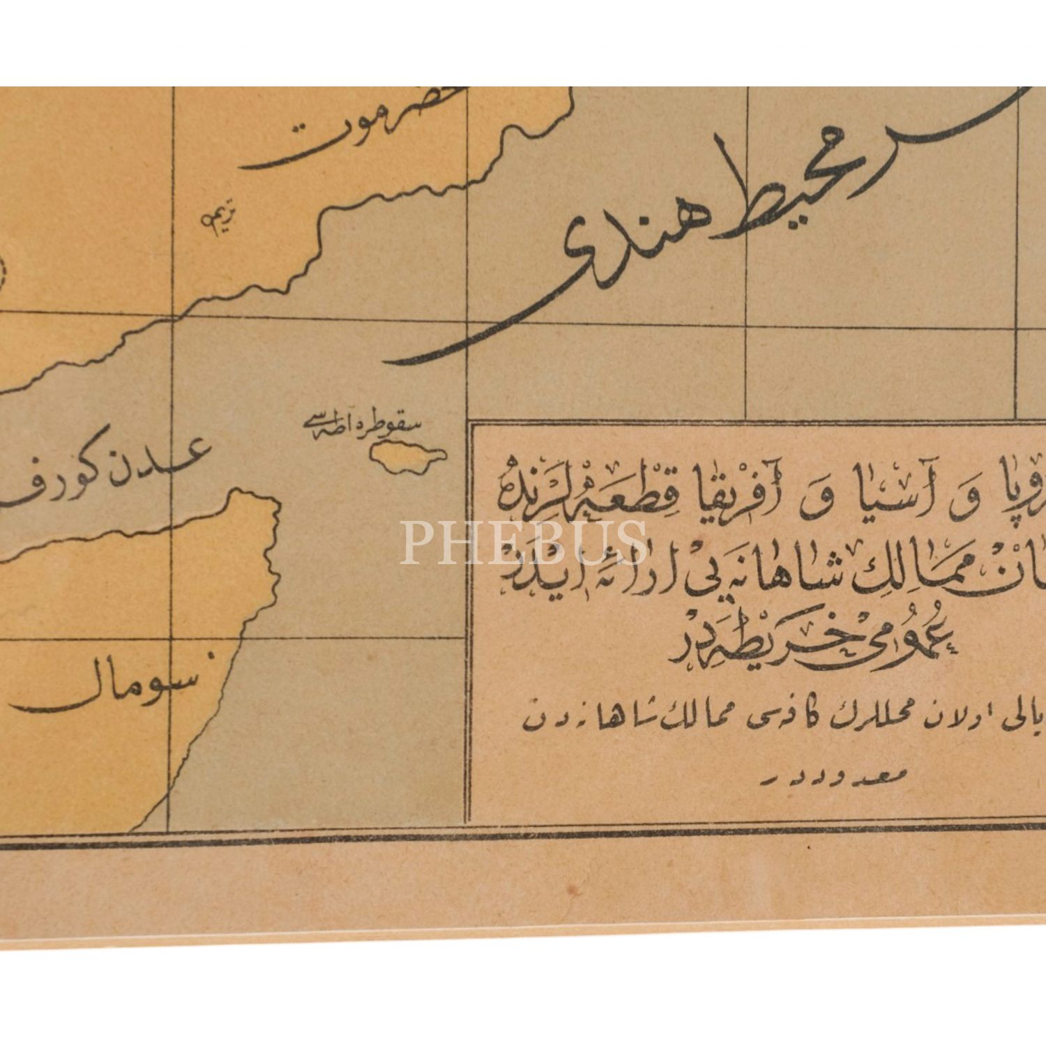 Osmanlı Devleti´nin hudutlarını gösteren, "Avrupa ve Asya ve Afrika Kıtalarında Bulunan Memalik-i Şahaneyi İrae Eder Umum Harita" başlıklı ve sol alt köşesine "Devlet-i Aliye-i OSmaniye Hududu" yazılı bir camaltı tabelanın yer aldığı Osmanlıca harita, çerçevesiyle birlikte 74x62 cm...