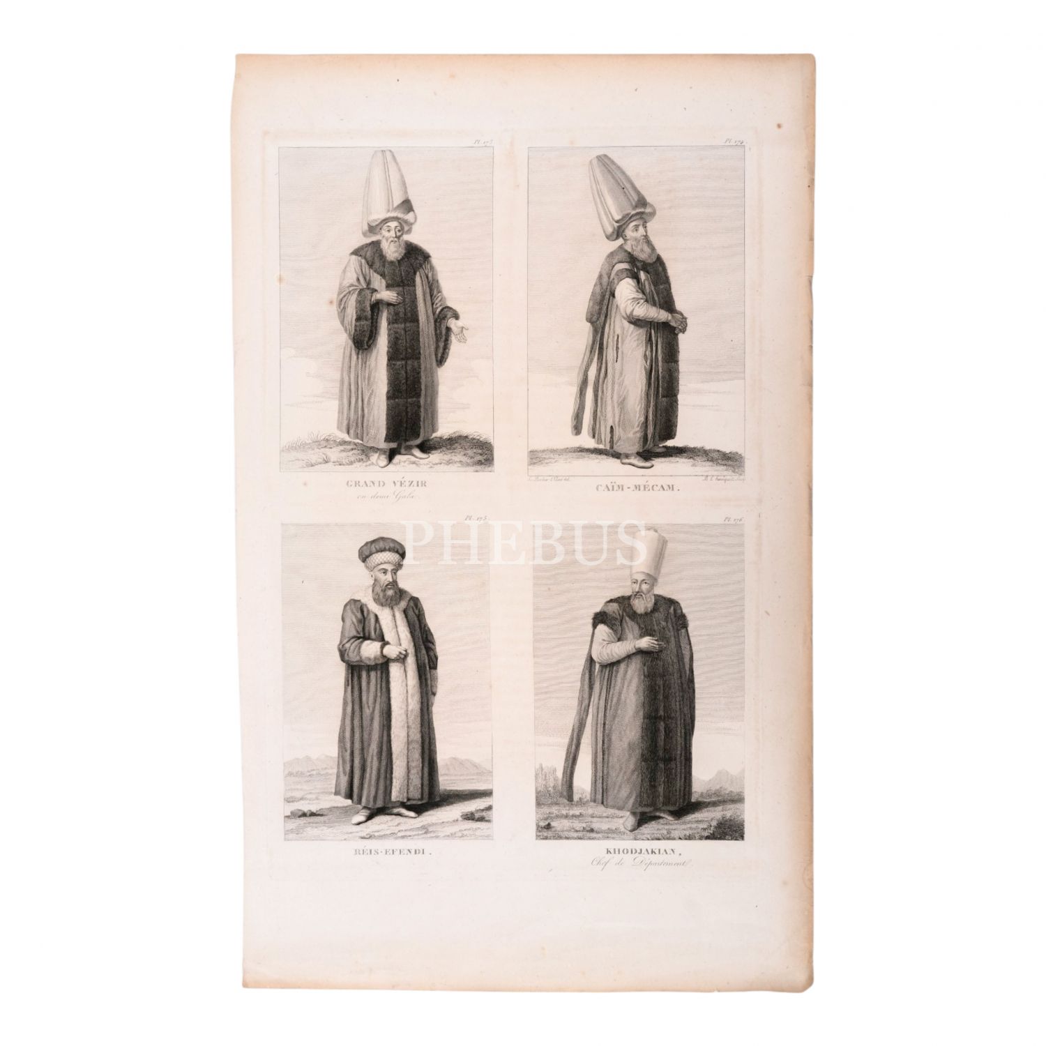 İsveç hizmetinde görev yapan Ermeni asıllı oryantalist Ignatius Mouradgea d´Ohsson´un eserinden (1790), Osmanlı kıyafetlerini gösteren dörtlü gravür sayfası, 32x51 cm...
