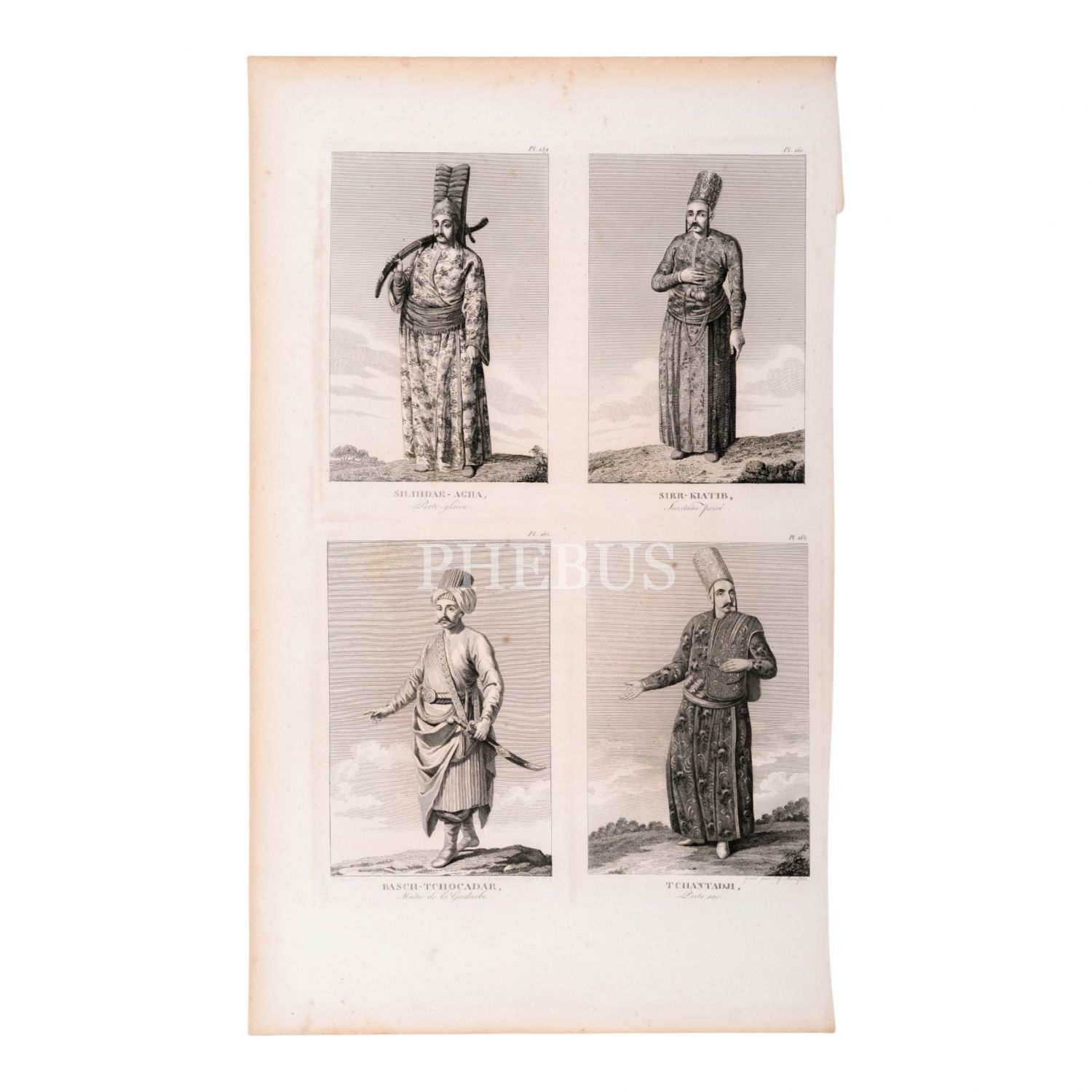 İsveç hizmetinde görev yapan Ermeni asıllı oryantalist Ignatius Mouradgea d´Ohsson´un eserinden (1790), Osmanlı kıyafetlerini gösteren dörtlü gravür sayfası, 32x51 cm...