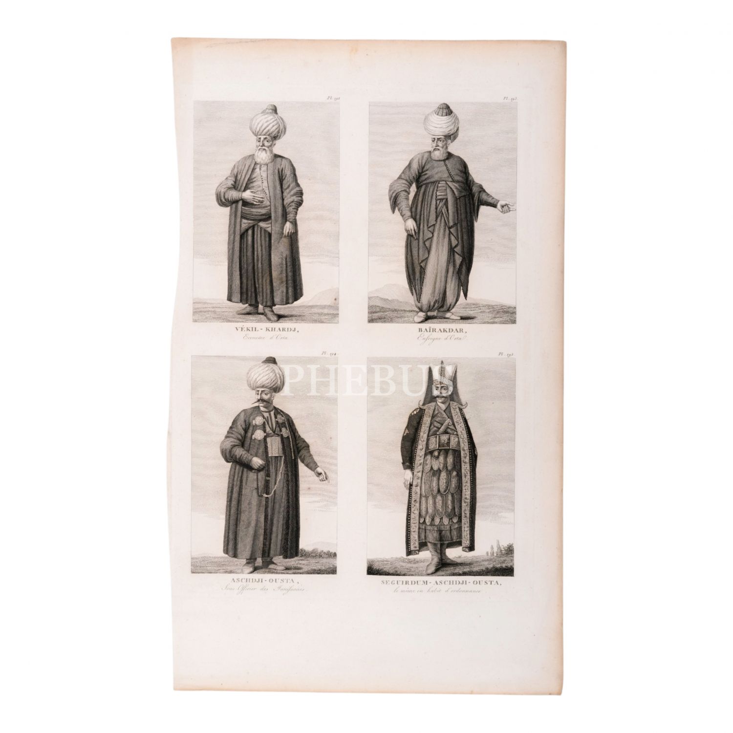 İsveç hizmetinde görev yapan Ermeni asıllı oryantalist Ignatius Mouradgea d´Ohsson´un eserinden (1790), Osmanlı kıyafetlerini gösteren dörtlü gravür sayfası, 32x51 cm...