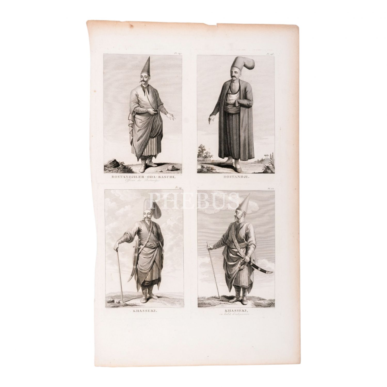 İsveç hizmetinde görev yapan Ermeni asıllı oryantalist Ignatius Mouradgea d´Ohsson´un eserinden (1790), Osmanlı kıyafetlerini gösteren dörtlü gravür sayfası, 32x51 cm...