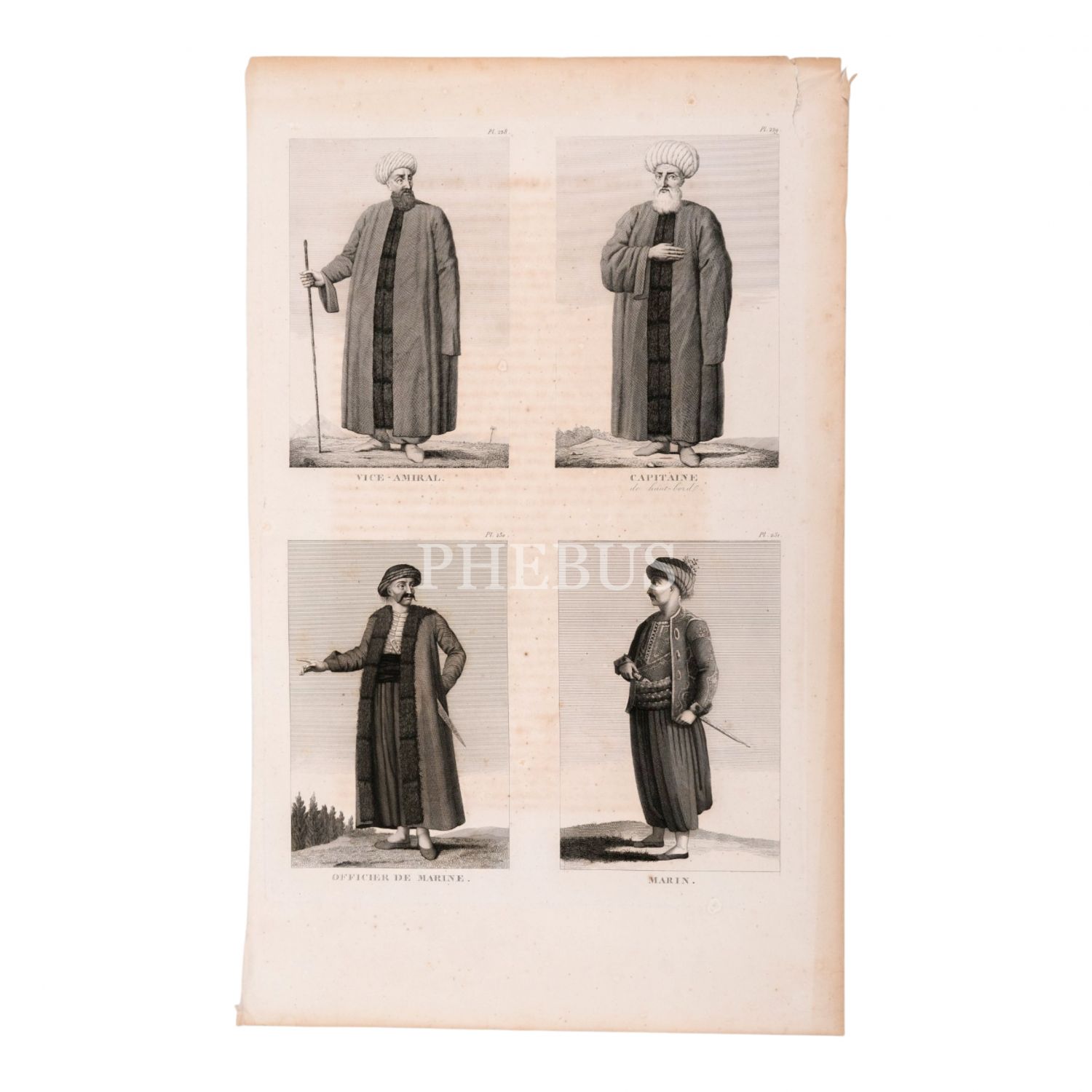 İsveç hizmetinde görev yapan Ermeni asıllı oryantalist Ignatius Mouradgea d´Ohsson´un eserinden (1790), Osmanlı kıyafetlerini gösteren dörtlü gravür sayfası, 32x51 cm...