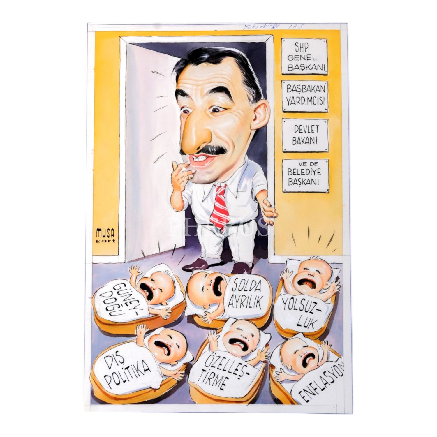 Musa Kart imzalı, Murat Karayalçın´ın "görevleri" ve memleket sorunları konulu karikatür, kâğıt üzerine çini mürekkebi ve sulu boya, 19x28 cm...