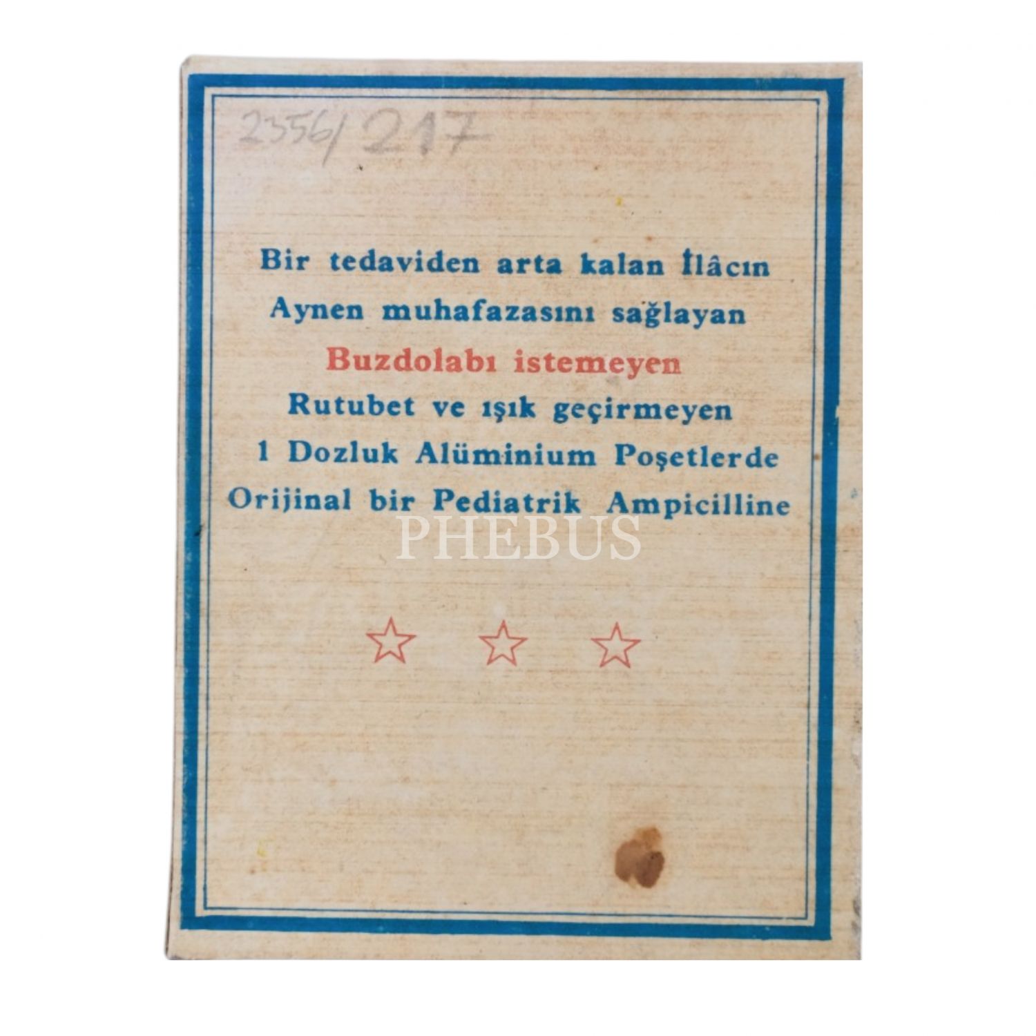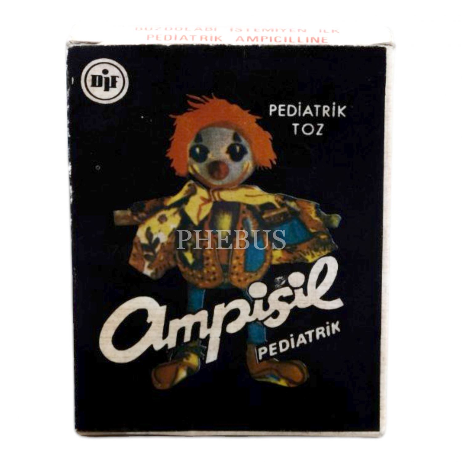 Prospektüsün yer aldığı orijinal kutusunda, "Pediatrik Toz" Ampisil, kutu içinde iki adet açılmamış paket mevcuttur, Doğu İlâç Fabrikası A.Ş., 6x8x1 cm...