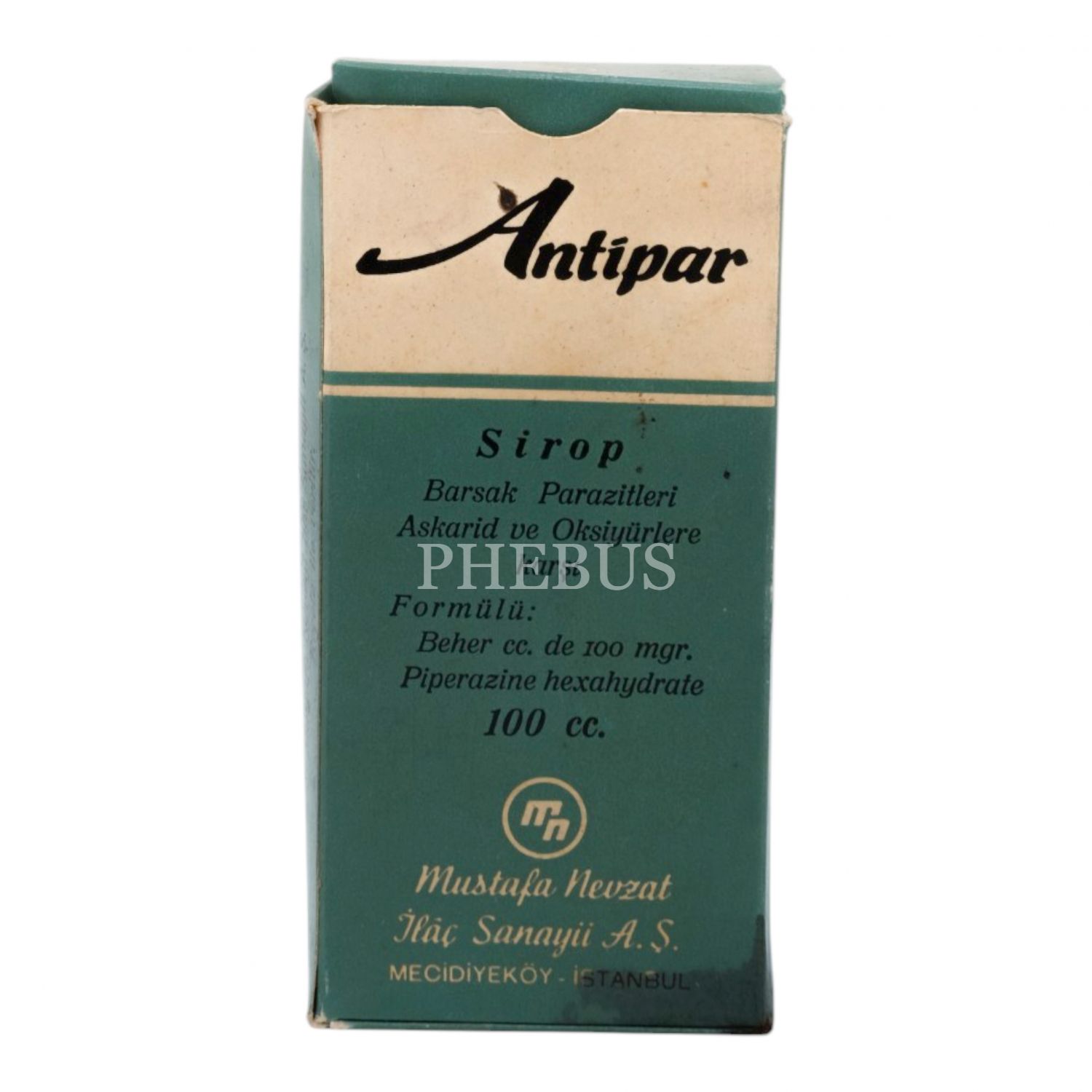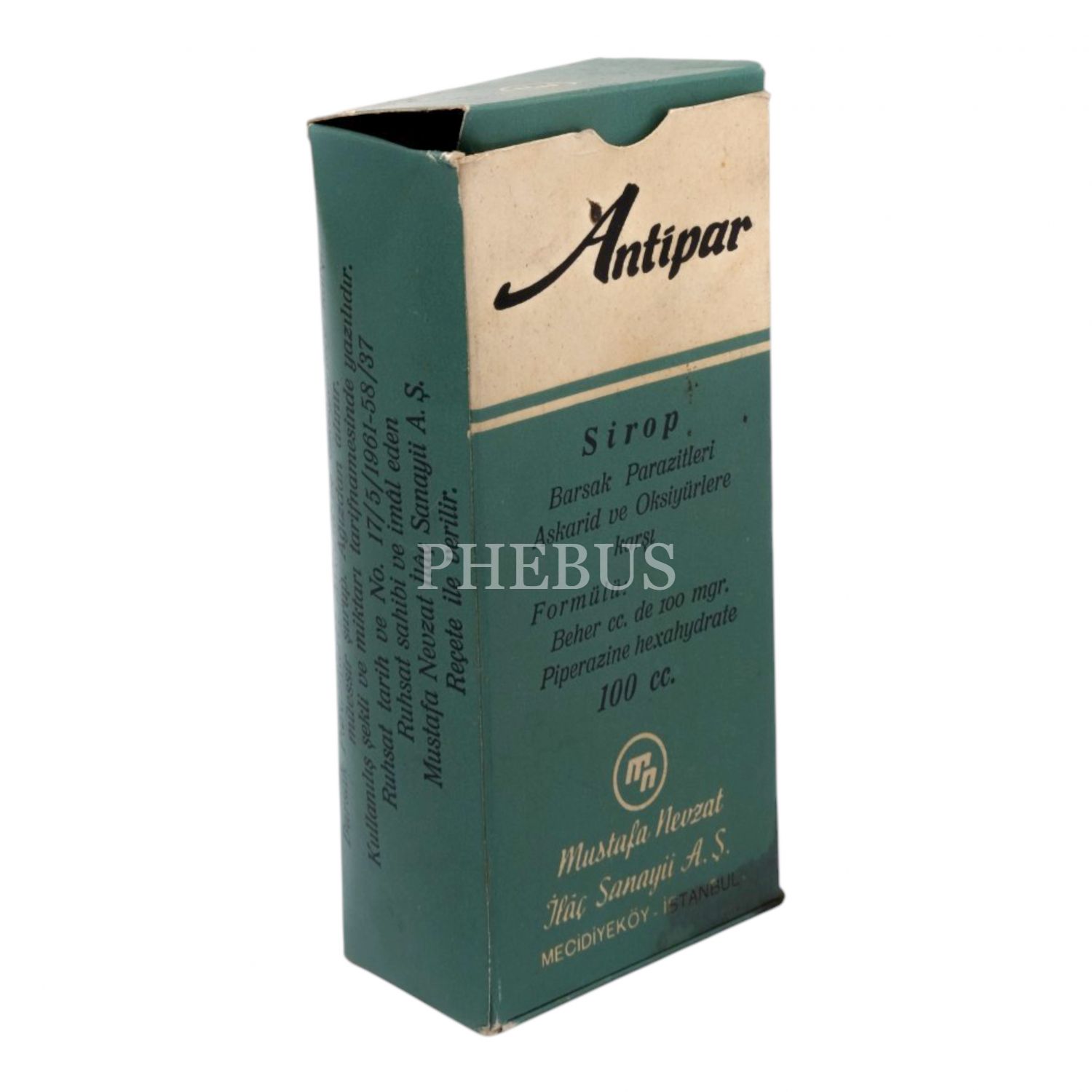 Prospektüsün ve kaşığın yer aldığı orijinal kutusunda, Antipar Sirop şişesi (dolu), Mustafa Nevzat İlâç Sanayii A.Ş. (Mecidiyeköy - İstanbul), kutu 7x14x4 cm...