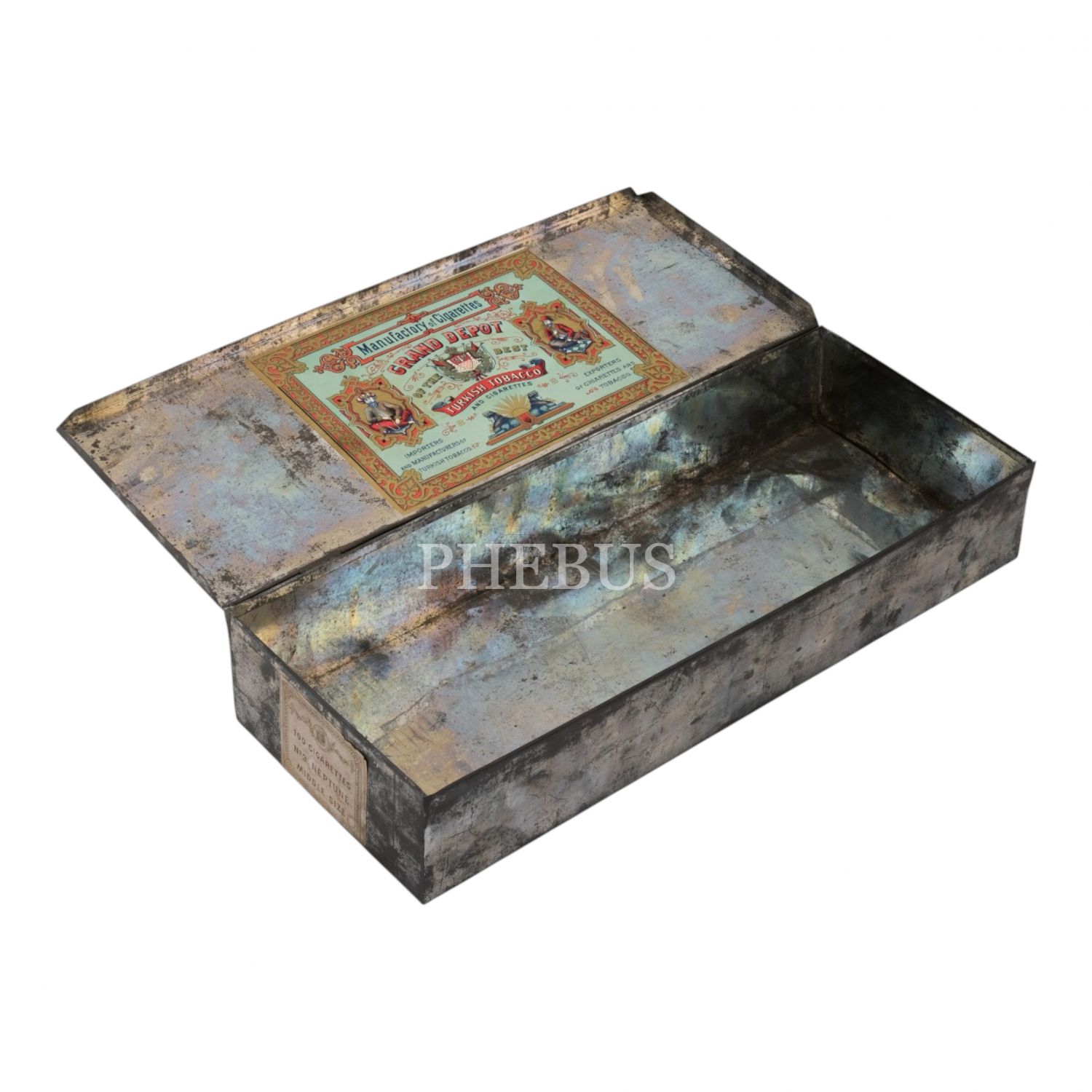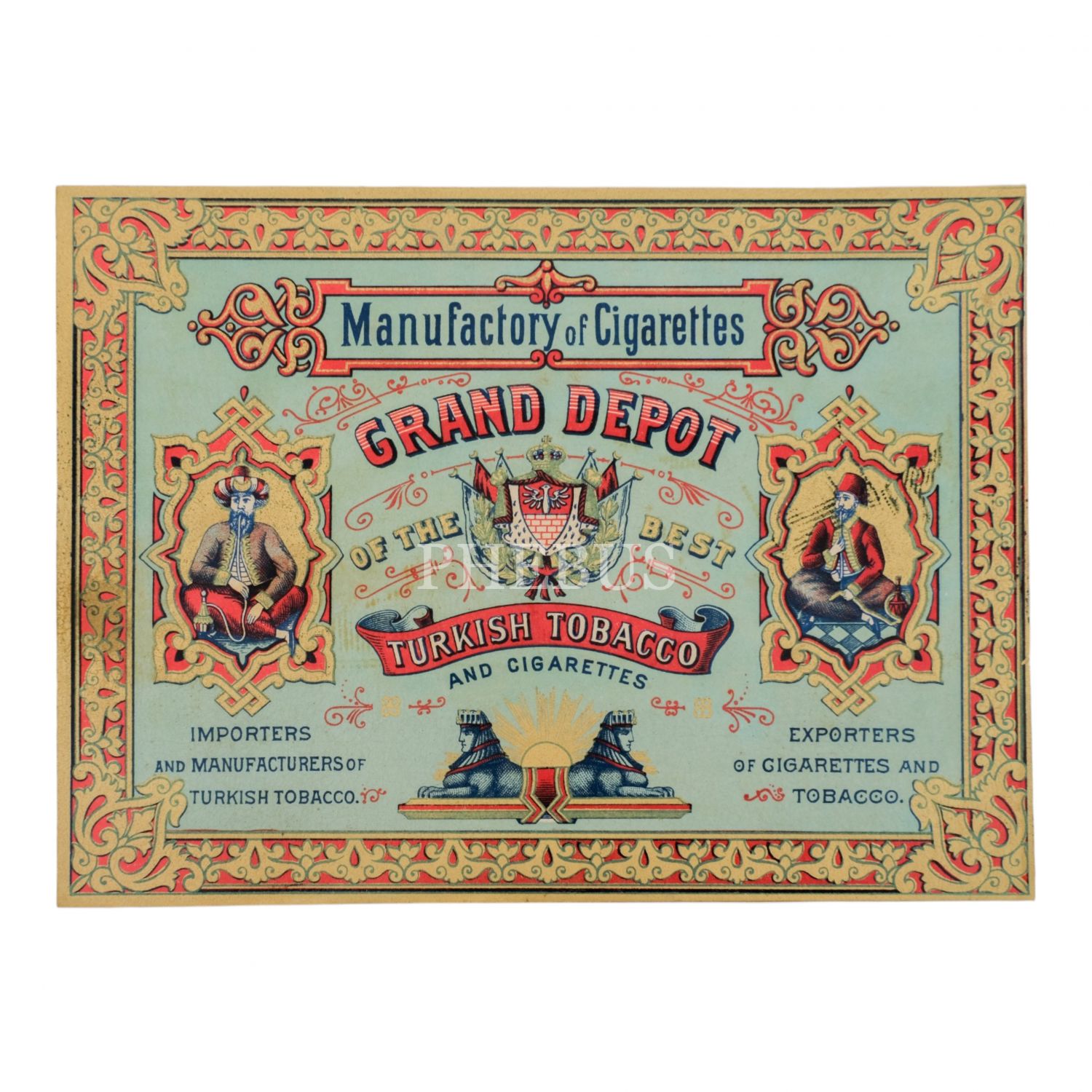 Kutu kapağının içinde ve dışında "Manufactory of Cigarettes Grand Depot of the best Turkish Tobacco and Cigarettes" yazılı; altın yaldızlı, oryantal figürler görselli taş baskı firma etiketi yer almaktadır. Kutunun sol ve sağ kenarındaysa "100 Cigarettes No. 3 Neptune. Middle Size." yazılı kutu etiketleri mevcuttur.