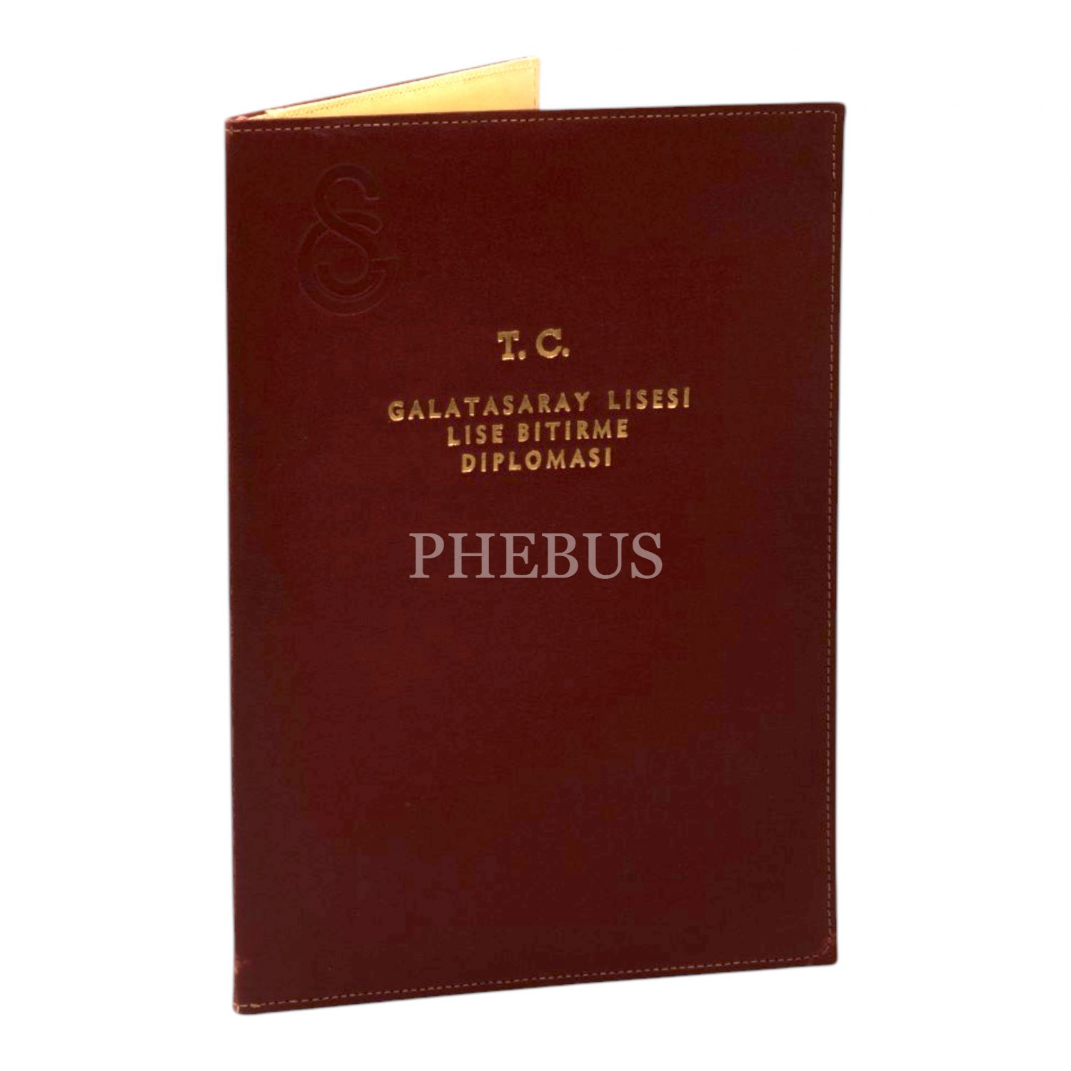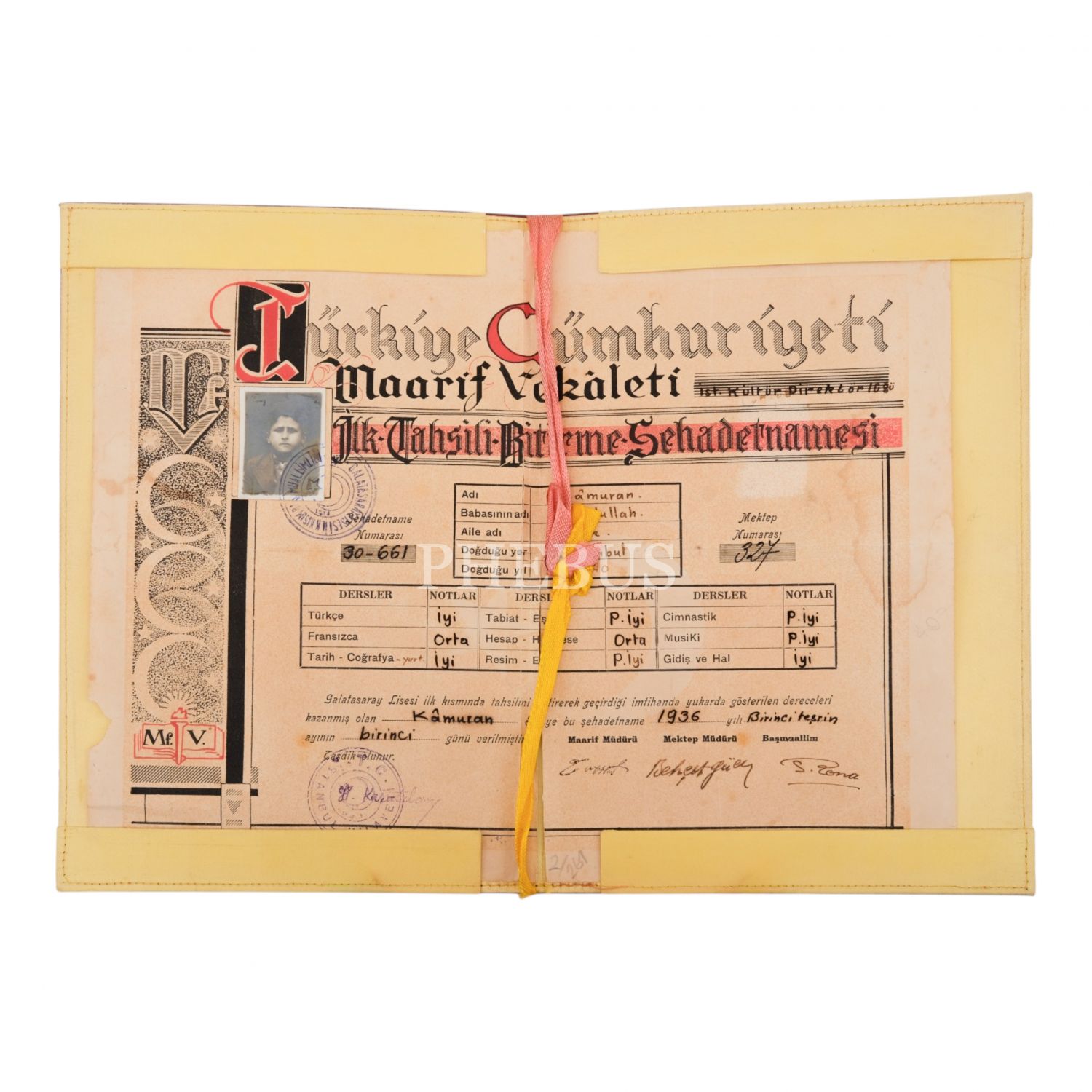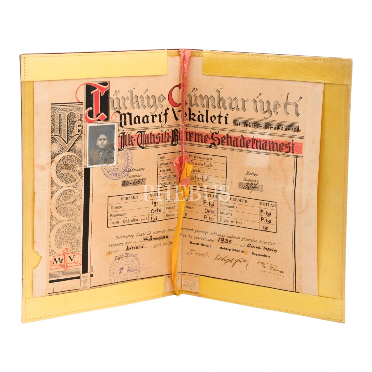 T.C. Galatasaray Lisesi Lise Bitirme Diploması, 1936 tarihli, Kâmuran Efendi adına doldurulmuş, orijinal koruma kabında, kabıyla birlikte (açık halde) 35x25 cm...