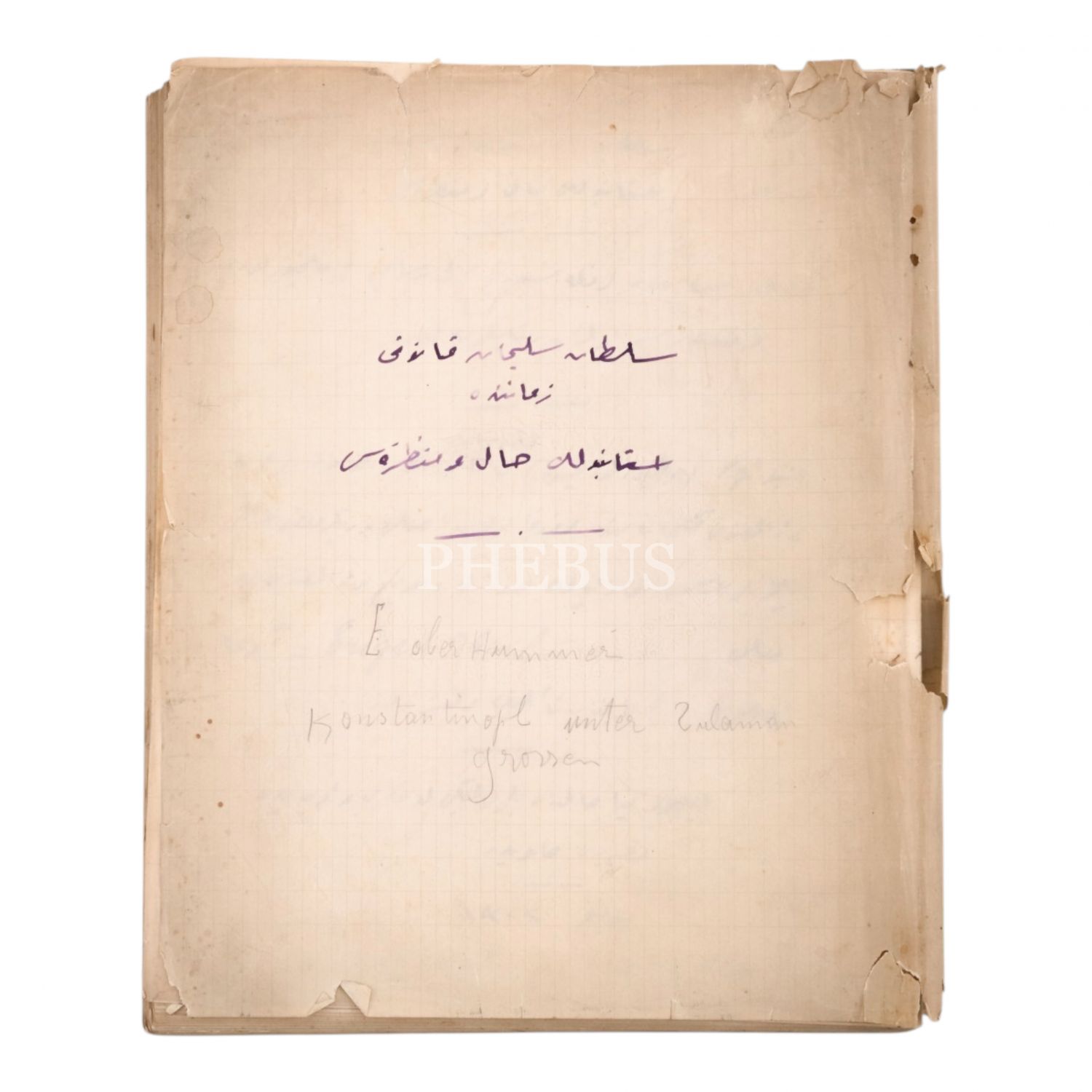 "Sultan Süleyman Kanuni Zamanında İstanbul´un Hal ve Manzarası" başlığıyla el yazısıyla kaleme alınmış; aslı İstanbul Üniversitesi Merkez Kütüphanesi´nde muhafaza edilen ve Eugen Oberhummer´in kaleme aldığı "Konstantinopel unter Sultan Suleiman dem Grossen" isimli kitabın, 152 sayfalık tercümesi ve sureti, 22x27 cm...