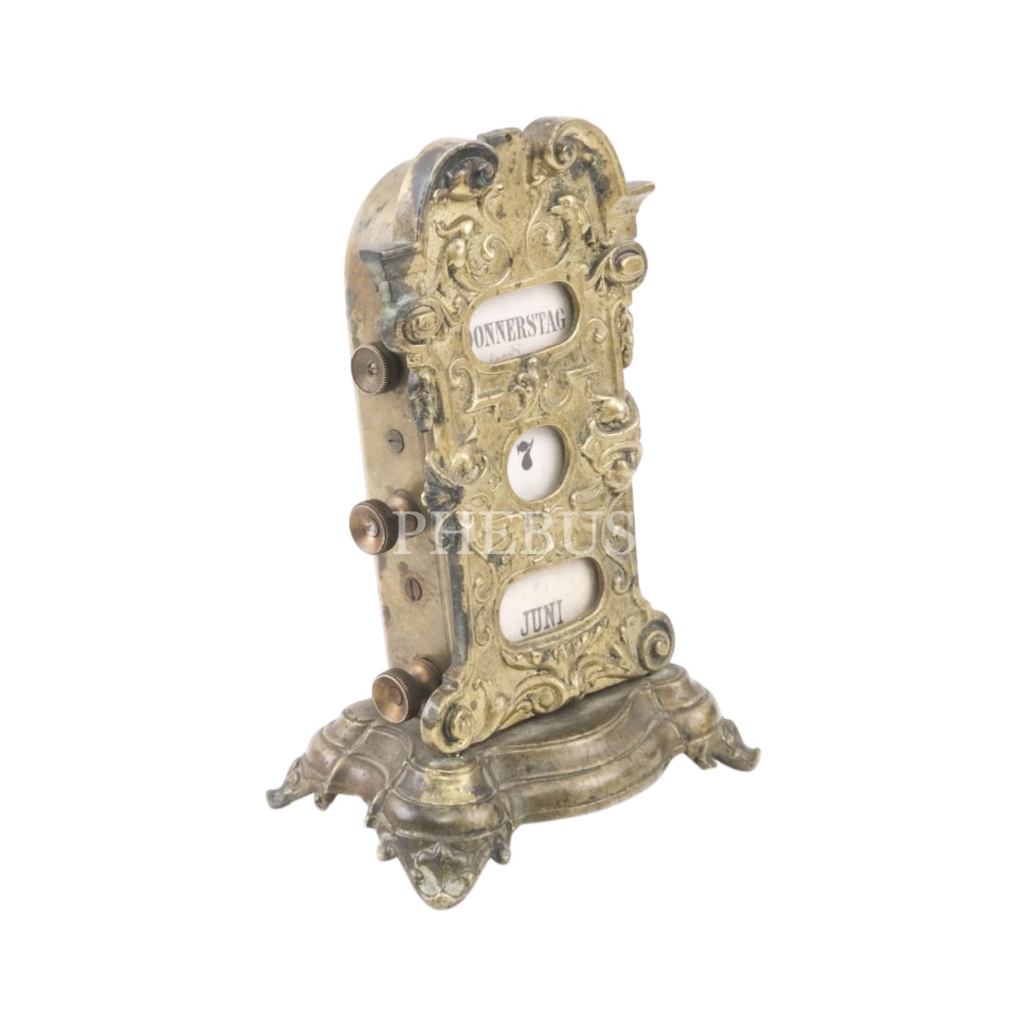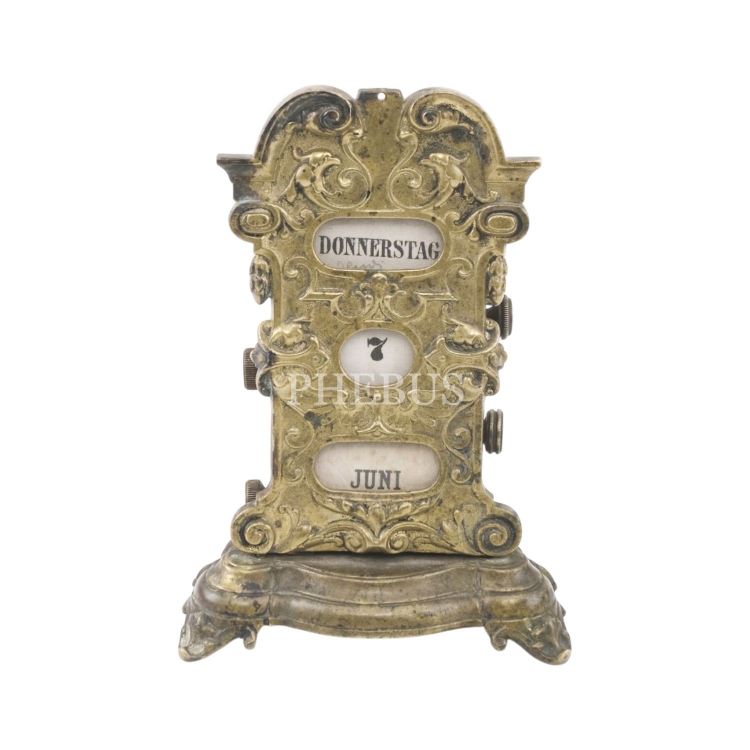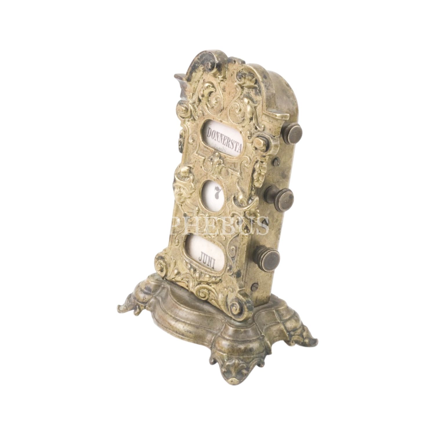 1800´lerin sonu veya 1900´lü dönemlerin başına ait Art Nouveau tarzında tasarlanmış pirinçten mamül Almanca ayaklı sonsuz masa takvimi...