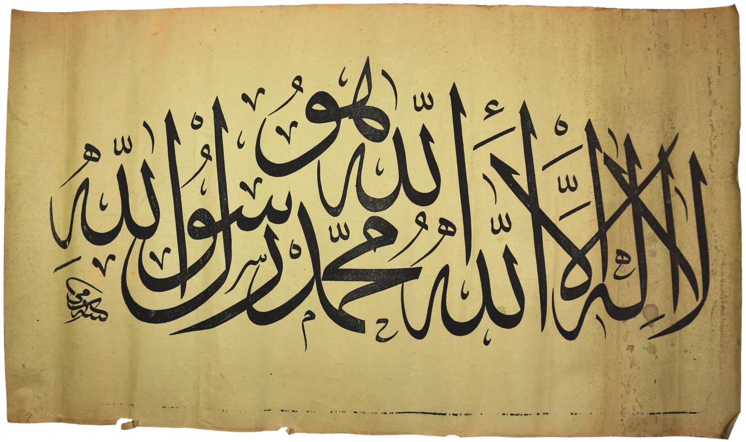 Matbu Celi Sülüs yazı, "Allah Hu La İlahe İllallah Muhammeden Resulullah", 'Sami' ketebeli.