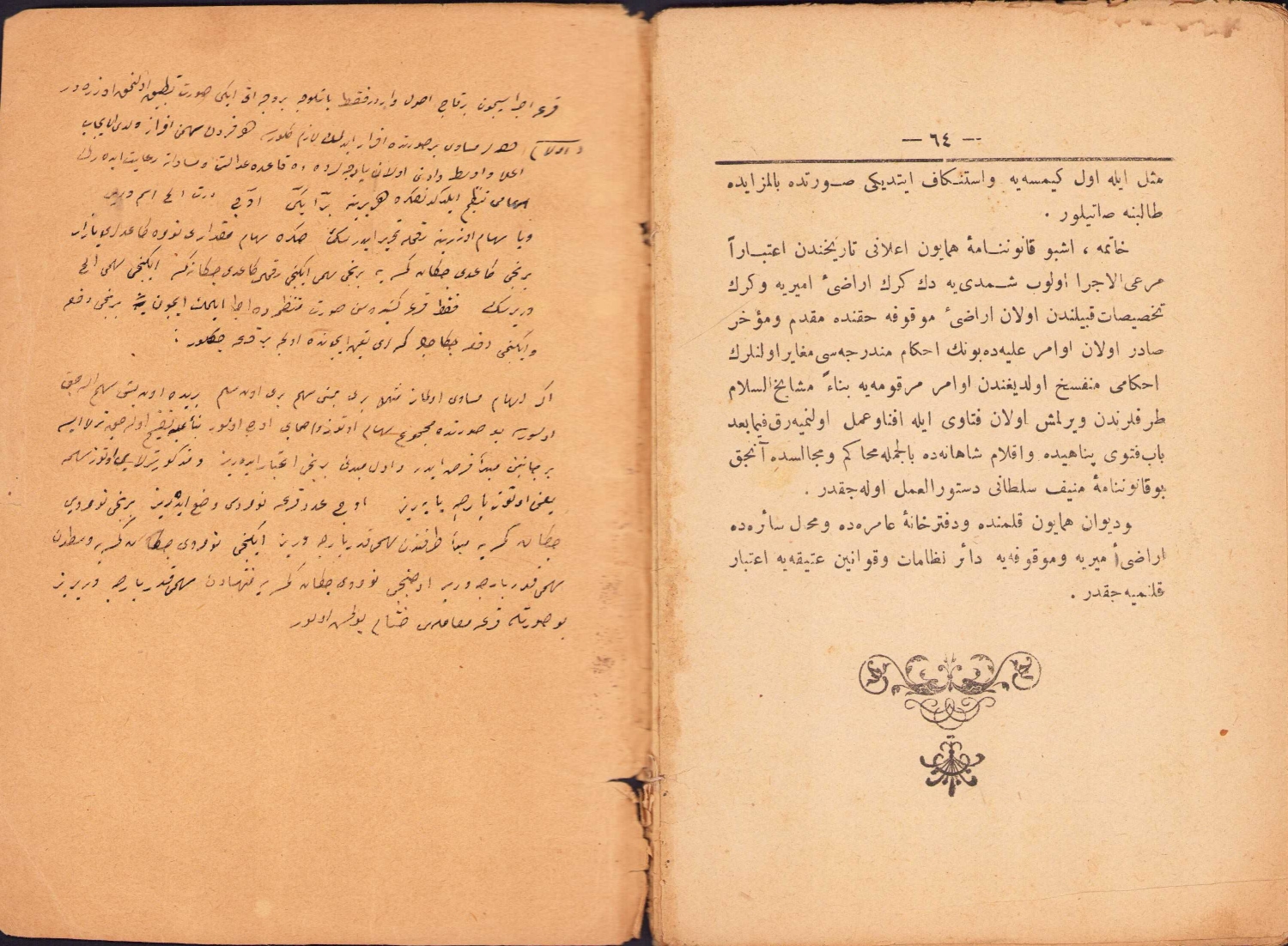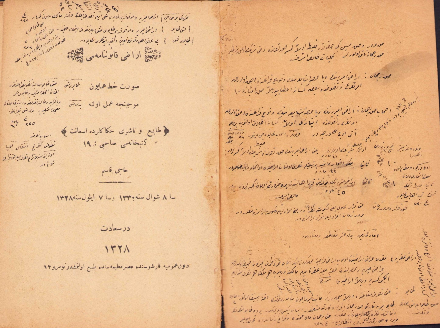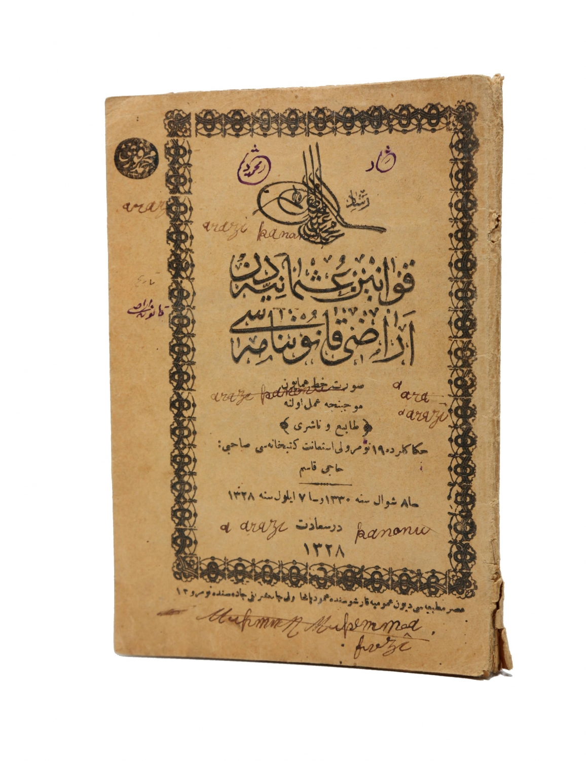 Osmanlıca Kavanin-i OsmaniyeDen Arazi Kanunnamesi, düzenleyen Hüseyin, Yayınevi Hacı Kasım, Dersaadet, 1327, yıpranmış, 64 sayfa, 12x18 cm