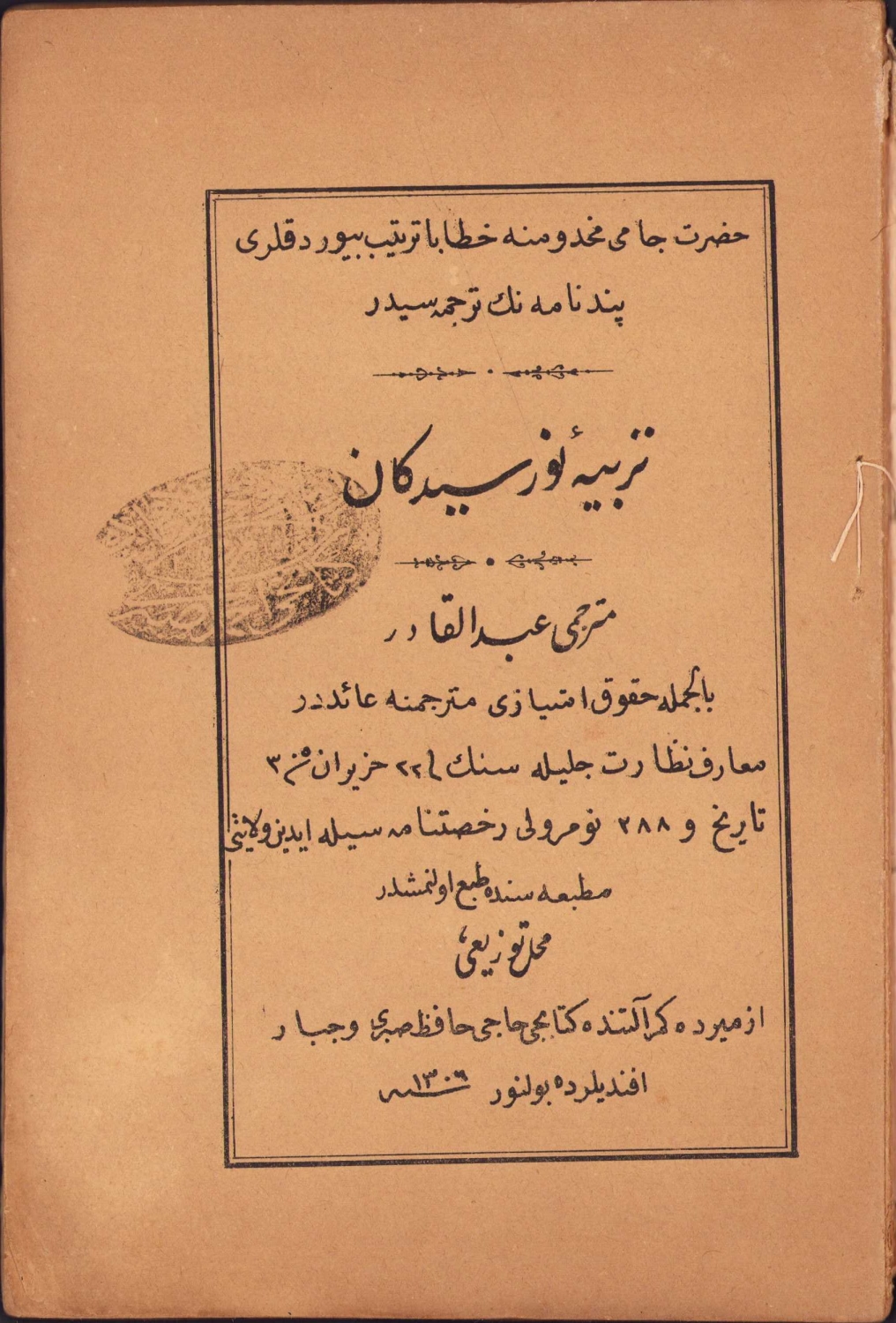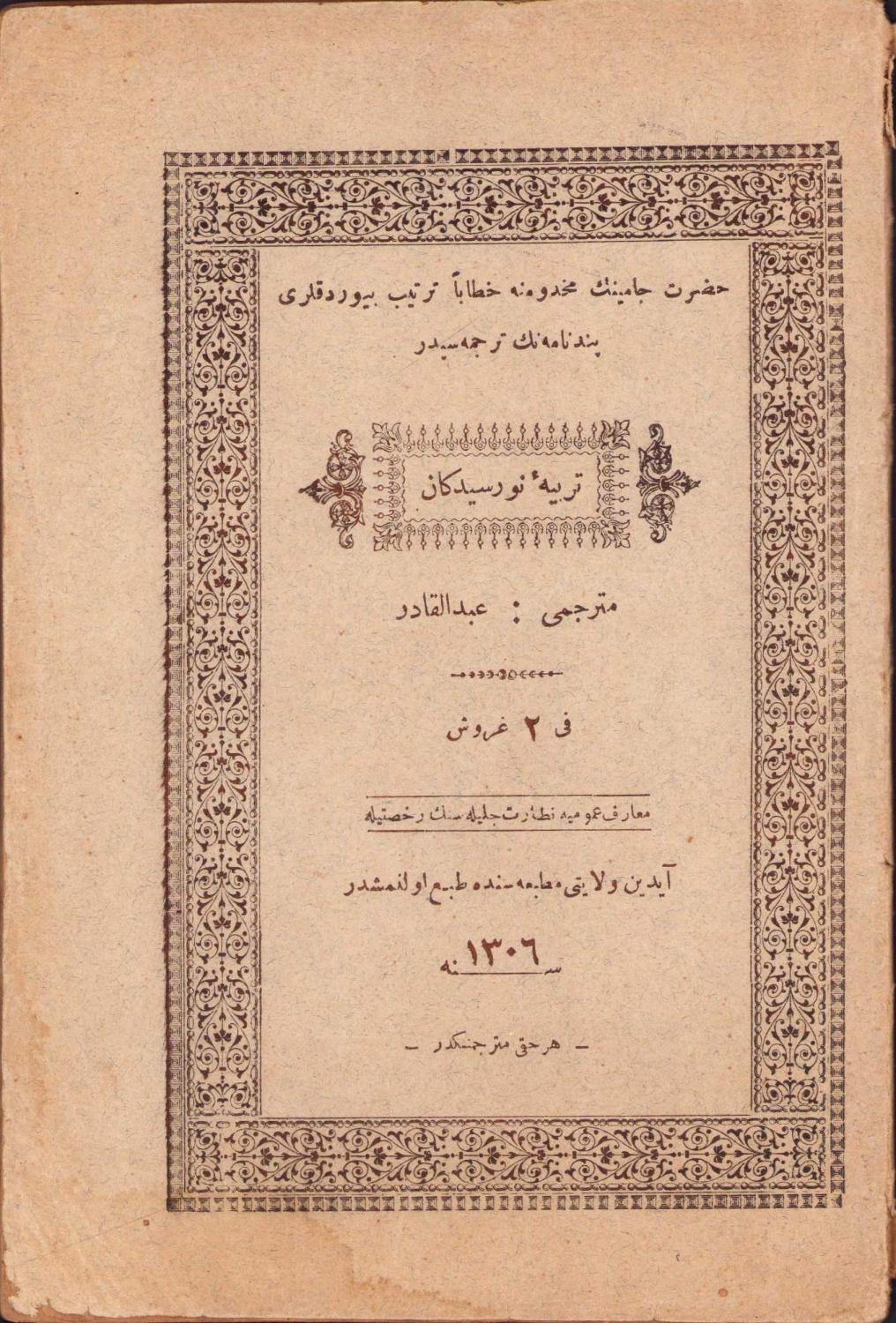 Osmanlıca Terbiye-i Nevresidegan, Nureddin Abdurrahman b. Ahmed Cami, çev., Abdülkadir, Aydın Vilayet Matbaası, 1306, 81 sayfa, 14x20 cm, ÖZEGE; 20539