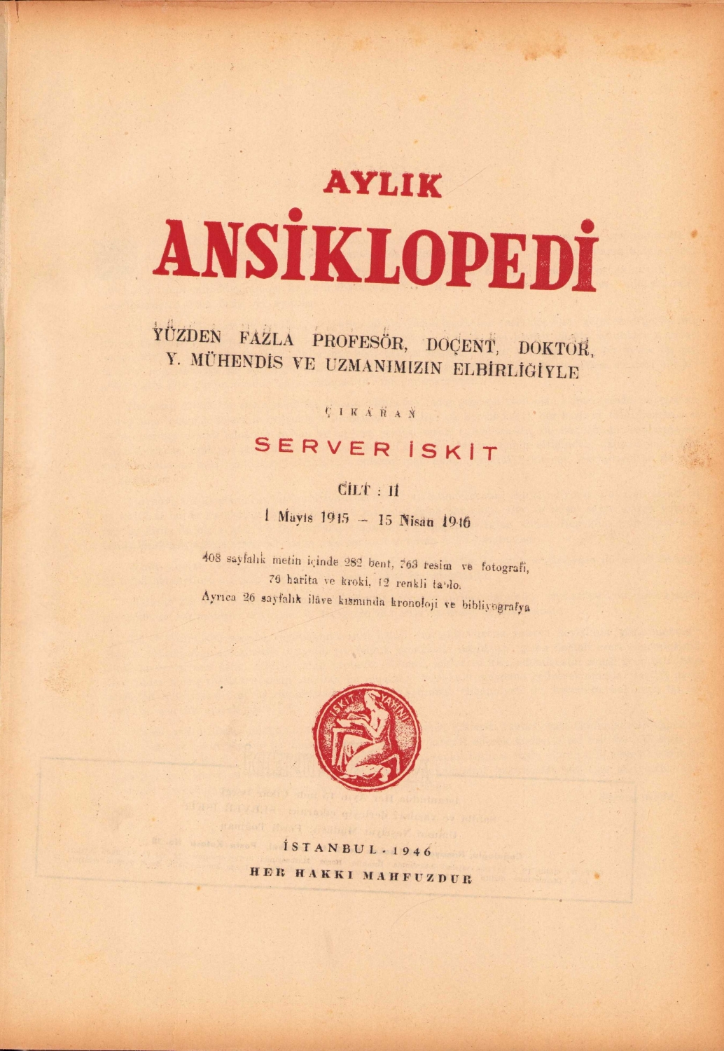 Aylık Ansiklopedi 2. cilt, çıkaran Server İskit, İstanbul, 1946, resimli, 370 sayfa, 24x33 cm