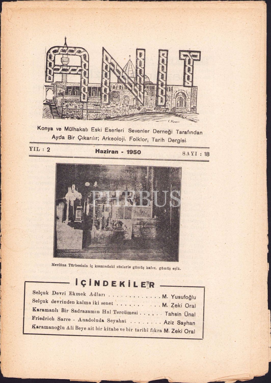 Anıt Dergisi, 1950, Konya ve Mülhakatı Eski Eserleri Sevenler Derneği tarafından ayda bir çıkarılır, 22 sayfa, haliyle, 20x29 cm