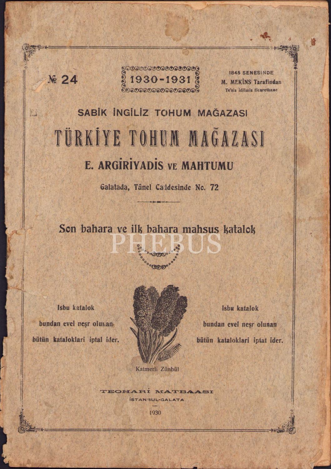 Sabık İngiliz Tohum Mağazası Türkiye Tohum Mağazası, E. Argiriyadis ve Mahtumu, Teohari Matbaası, İstanbul, 1930, kapak haliyle, 40 sayfa, 16x24 cm