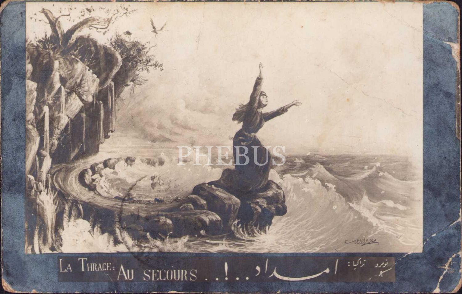 Kurtuluş Savaşı Propaganda kartı, “Trakya İmdat” Karanlık girdaplar içerisinde Türk kadını. Çizeri Selahattin imzalı ithaflı, Mefkure Kartları No:9, haliyle