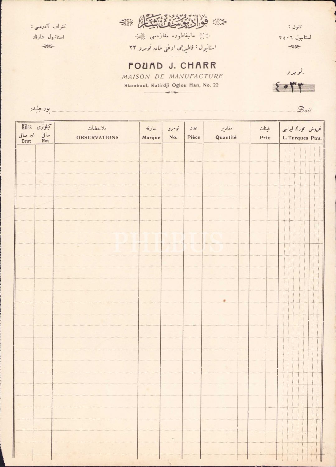 Osmanlıca fransızca Fuad Yusuf Şar Manifatura Mağazası antetli fatura, 20x29 cm