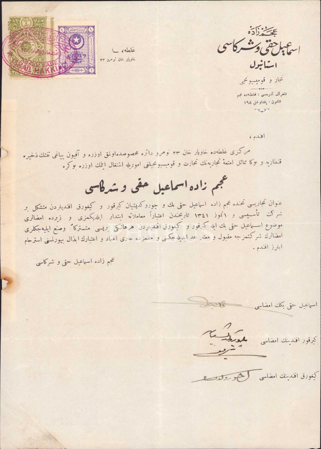 Osmanlıca Acem Zade İsmail Hakkı ve Şürekası İstanbul antetli imza sirküleri, damgalı, 19x26 cm