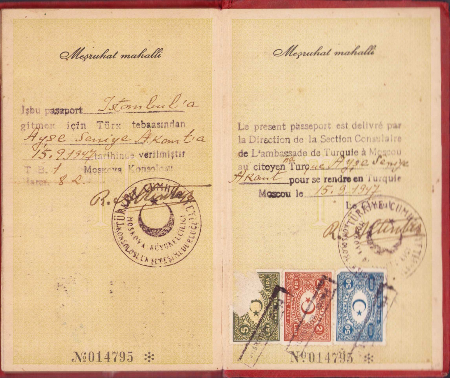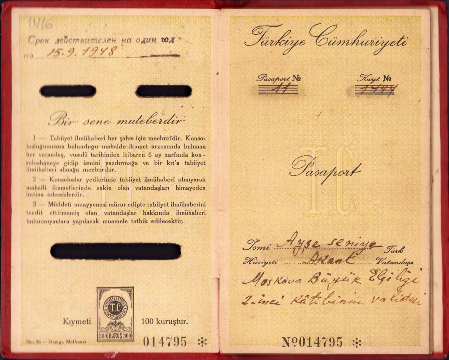 Türkiye Cumhuriyeti Pasaport, Moskova Büyükelçiliği İkinci Katibinin Validesi Ayşe Seniye, fotoğrafsız, 1947 tarihli, 10x16cm