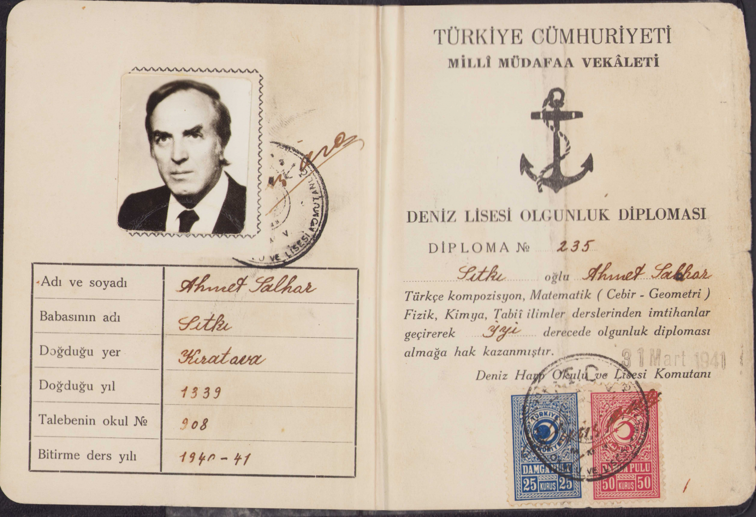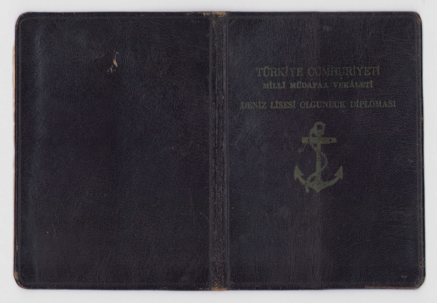 Türkiye Cumhuriyeti Milli Müdafaa Vekaleti Deniz Lisesi Olgunluk Diploması, 1941 tarihli, Makedonya Kratova detaylı, kendi orjinal kılıfında, 11x15 cm
