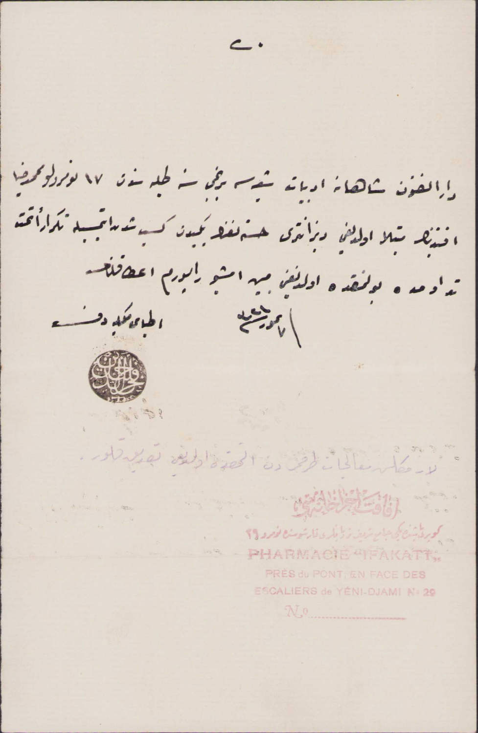 Ifakat Eczahanesi antetli, Osmanlıca yazılı, 7 Temmuz 1903 tarihli, Yenicami adresli, Osmanlı mühürlü