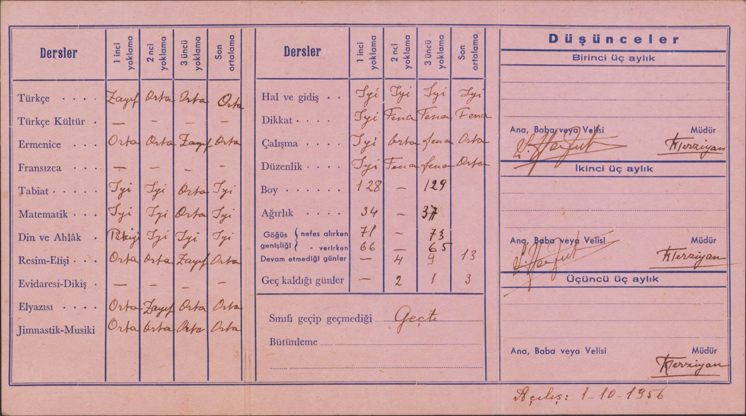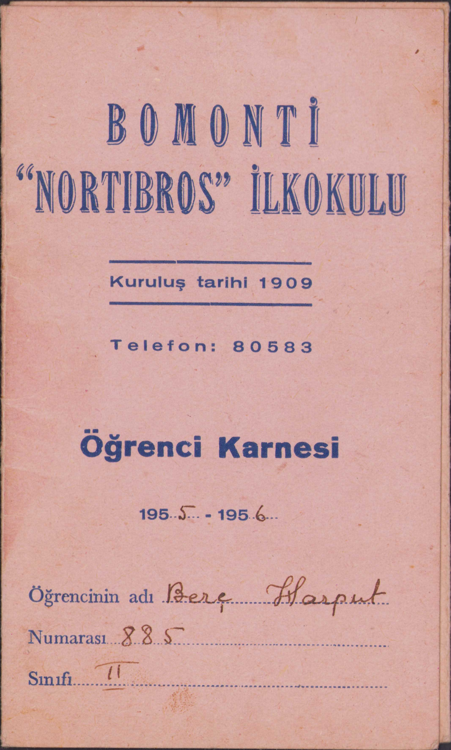Azınlık Bomonti Nortibros İlkokulu Öğrenci Karnesi, 1956 tarihli, katlamalı 3 yaprak, Narin Matbaası baskısı, 26,5x15 cm