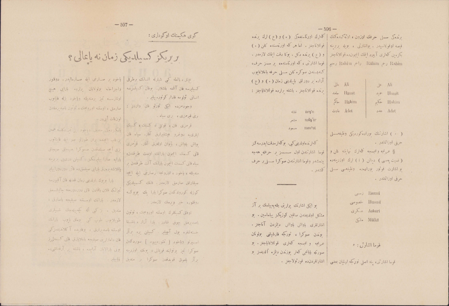 Osmanlıca yazılı, 8 sayfa, içerisinde Latin alfabesini tanıtan ve kelimelerin nasıl yazıldığını gösteren bir makale de var